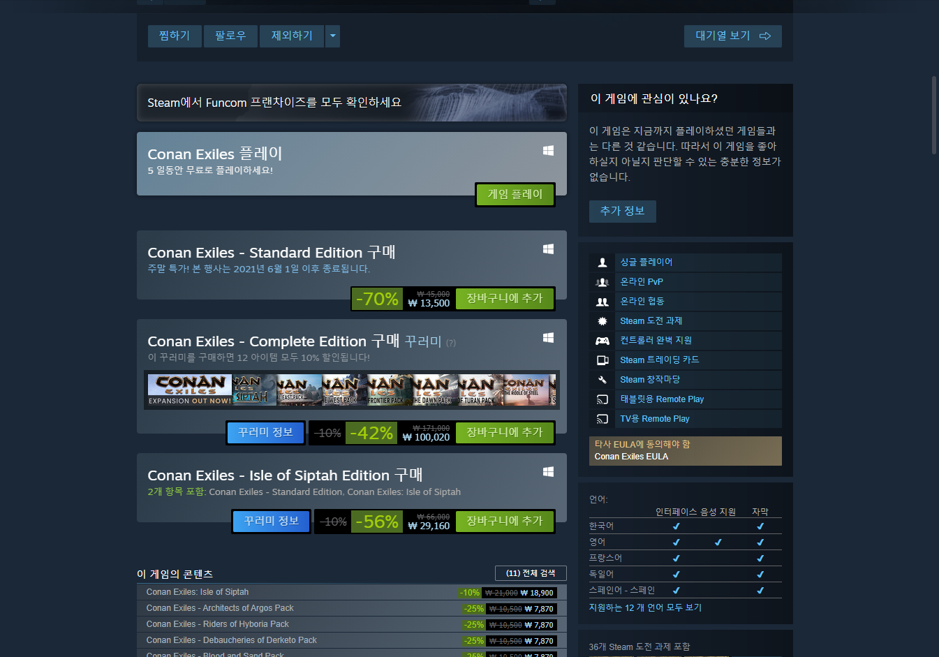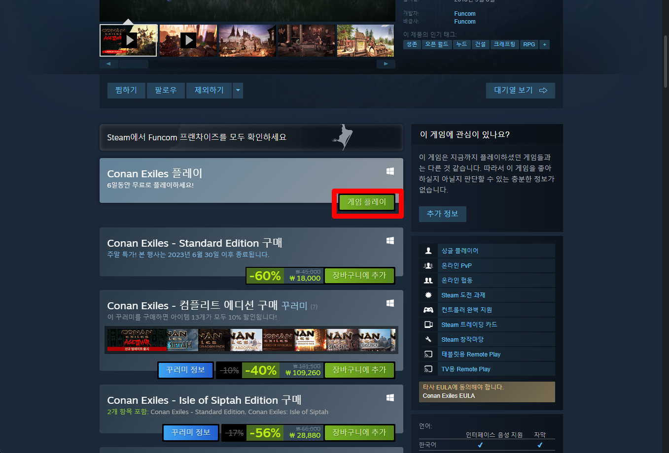 Conan Exiles 게임페이지를 조금 내려서 [게임 플레이] 버튼을 클릭하면 됩니다.