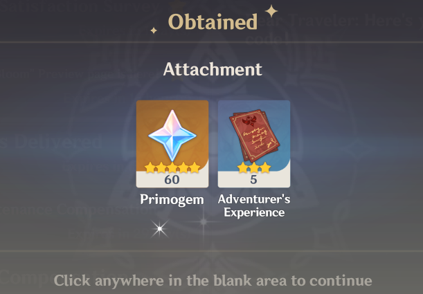 | NT8SU92DKFRZ | 60 Primogems 5 Adventurer's Experience |