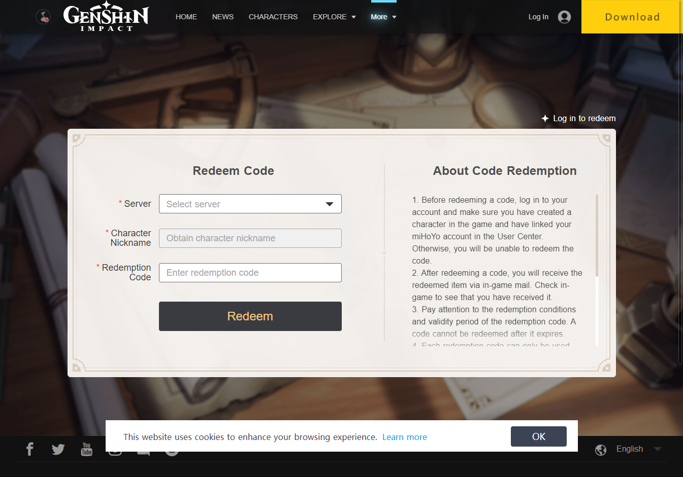 Genshin 원신 원석 Redeem Code 모음, 등록페이지