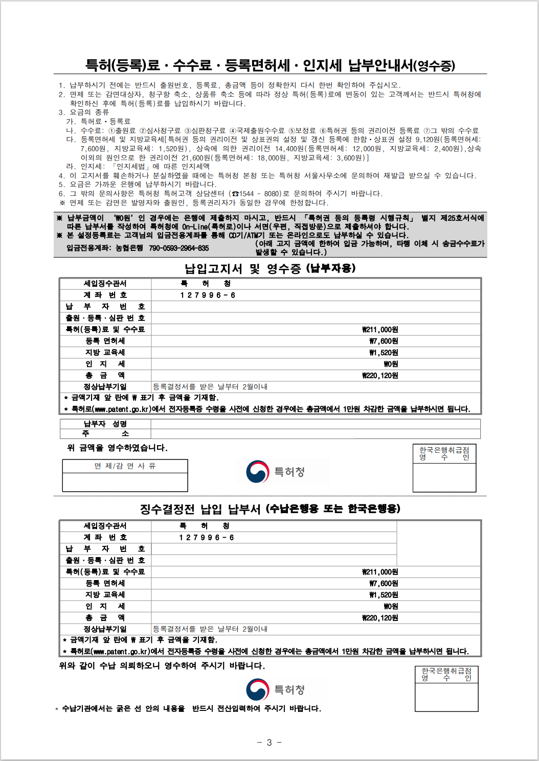 - 특허(등록)료∙수수료∙등록면허세∙인지세 납부안내서(영수증)