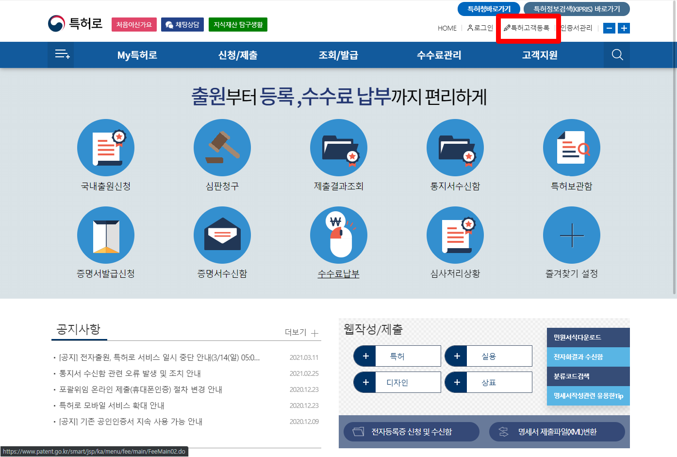 상단메뉴에서 [특허고객등록] 버튼을 클릭합니다.