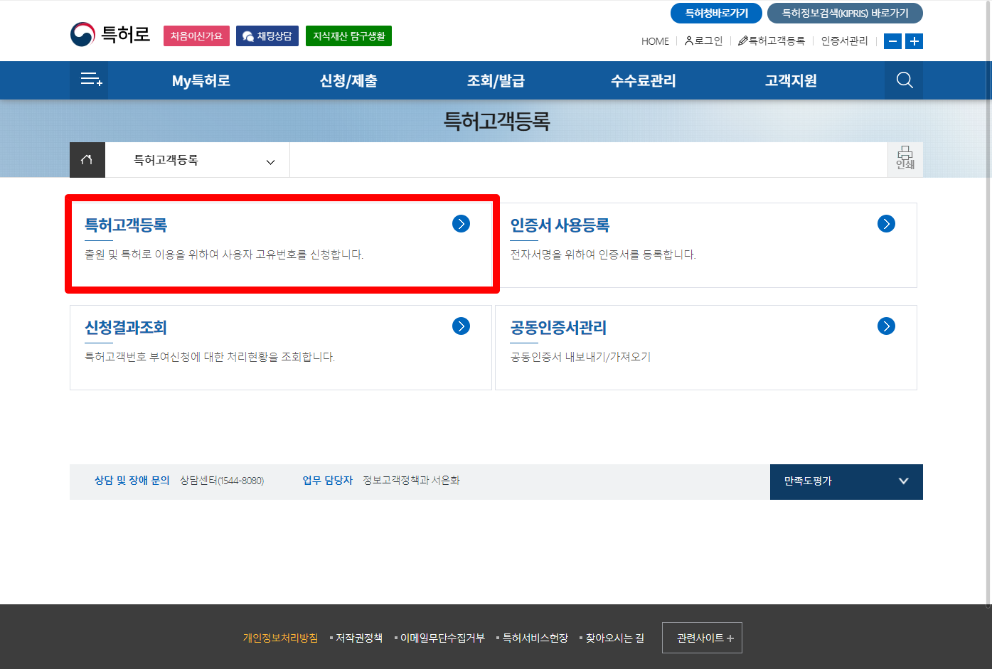 [특허고객등록] 클릭합니다.