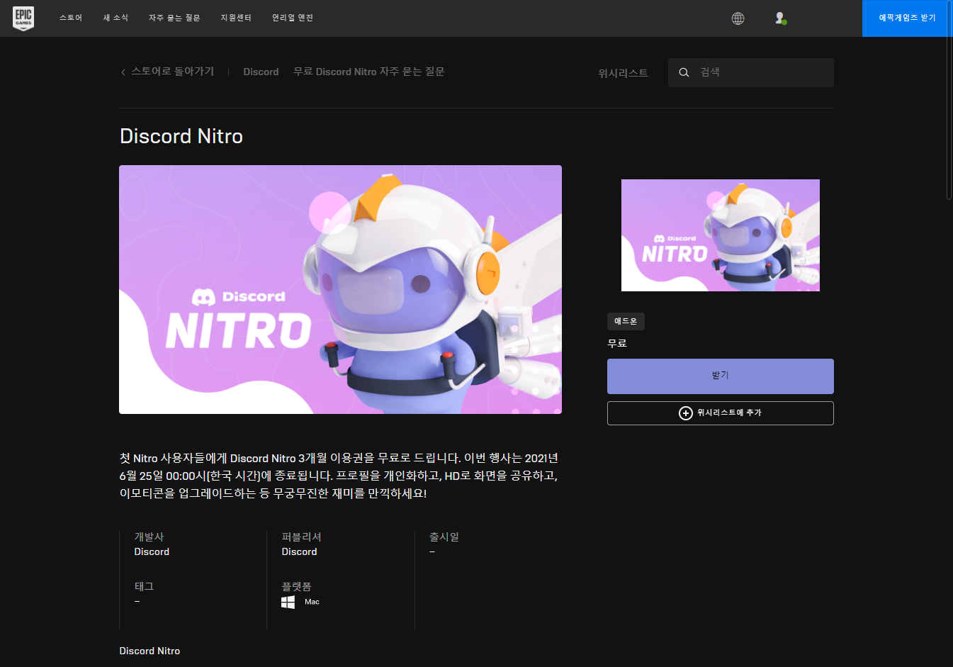 Discord Nitro 3개월 이용권 무료 - epic 에픽게임증