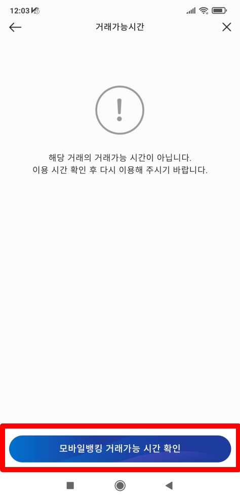 아래에 있는 [모바일뱅킹 거래가능 시간 확인] 버튼을 클릭하면 거래 가능 시간을 확인할 수 있습니다.