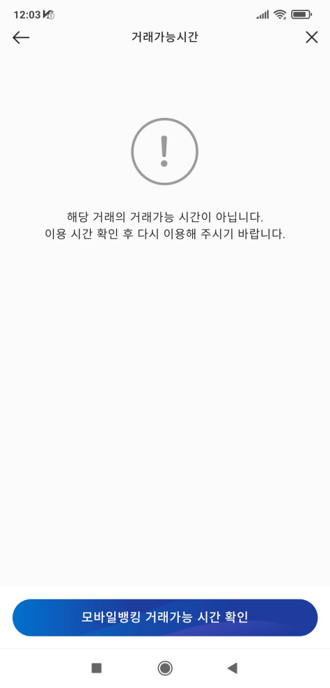 앱 실행시 거래가능시간이 아니면 아래와 같은 화면이 나타납니다.