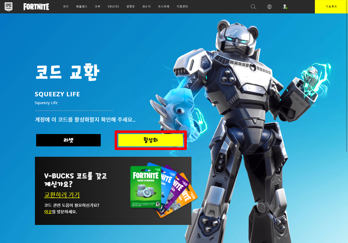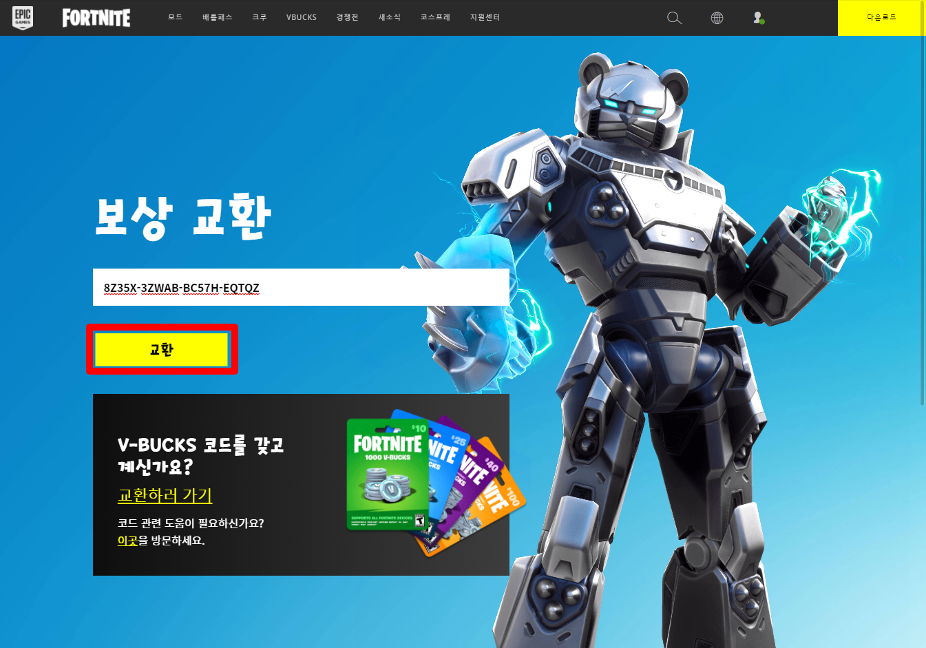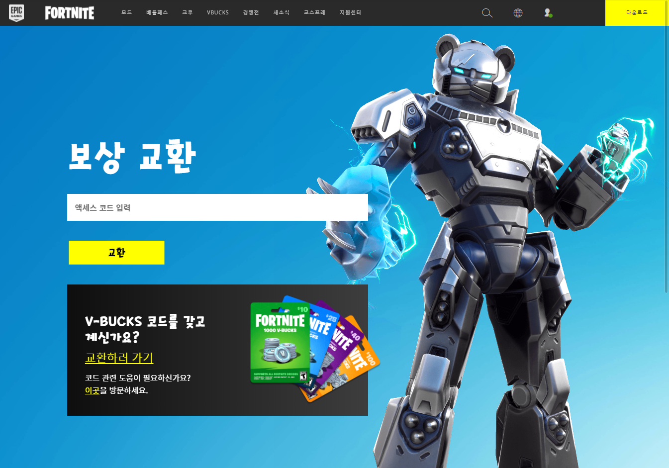 포트나이트 코드 교환 페이지에 접속합니다.