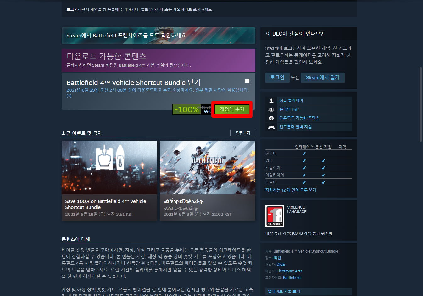 페이지를 아래로 내린 후 [계정에 추가] 버튼을 클릭하면 나의 게임라이브러리에 추가됩니다.