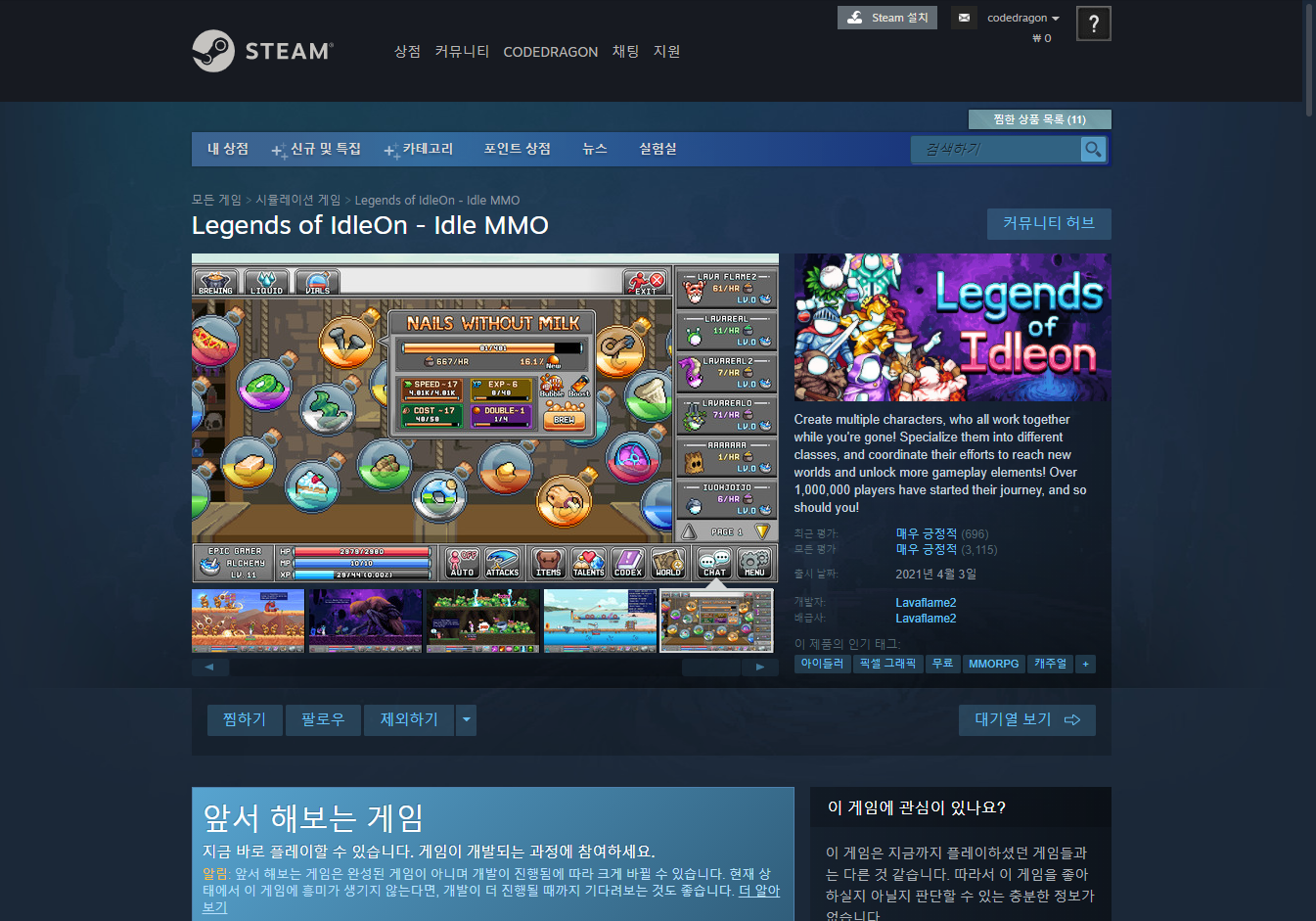 "Legends of IdleOn - Idle MMO" 게임 페이지 - Steam 스팀