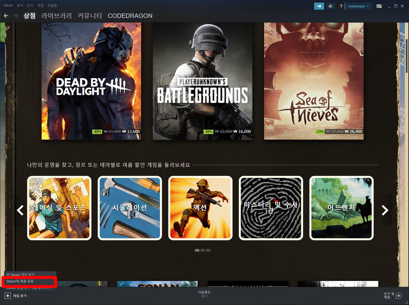 나오는 메뉴에서 [Steam에 제품 등록]을 클릭합니다.