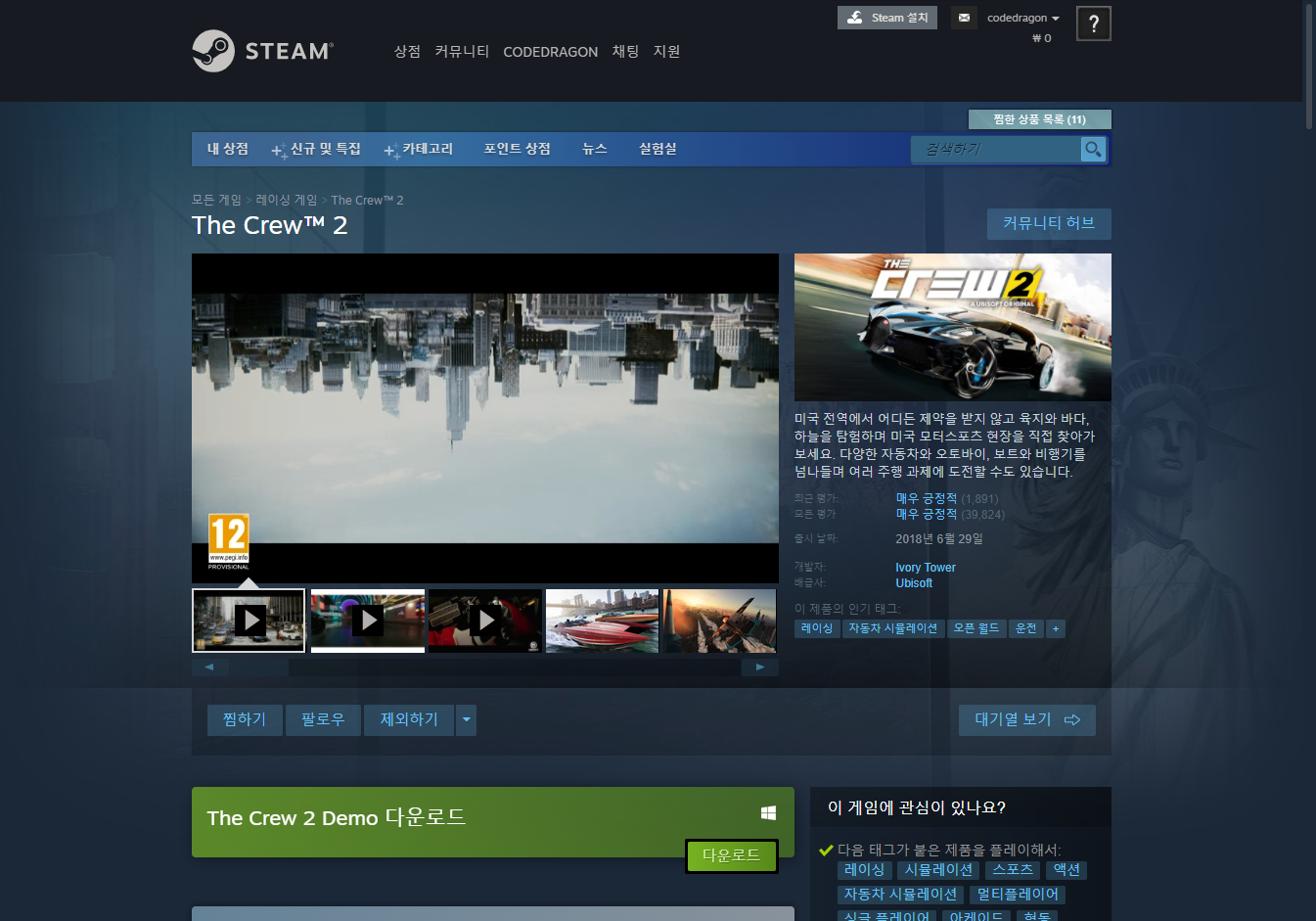 금주 게임은 "자동차 레이싱" 게임인 "더크루2" 게임입니다.