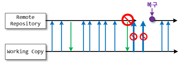 | SVN의 서버와의 연결중단 온라인일 경우에만 커밋이 가능합니다. 원격저장소와의 연결이 끊기면 버전관리가 중단되고 복구 이후 가능합니다. ![]() |