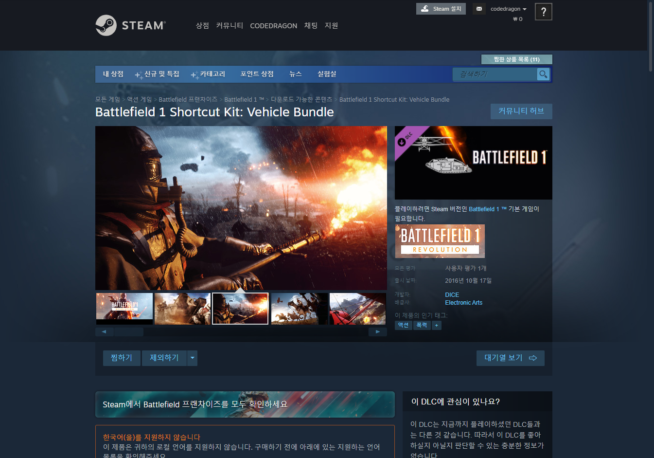 - Battlefield 1 Shortcut Kit: Vehicle Bundle DLC 게임 페이지 (DLC)