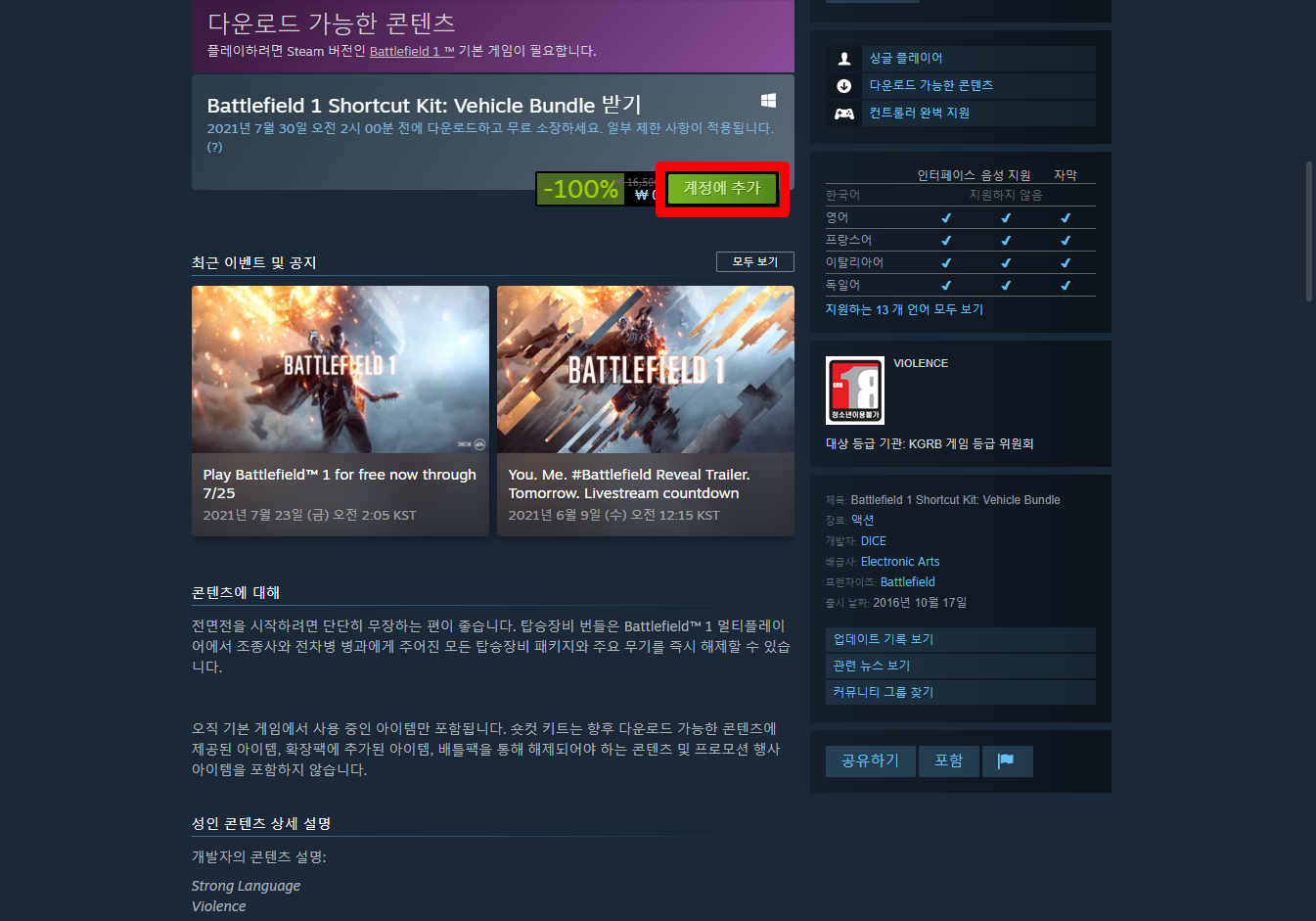 게임페이지를 조금 내려 [계정에 추가] 버튼을 클릭하면 게임라이브러리에 추가됩니다.