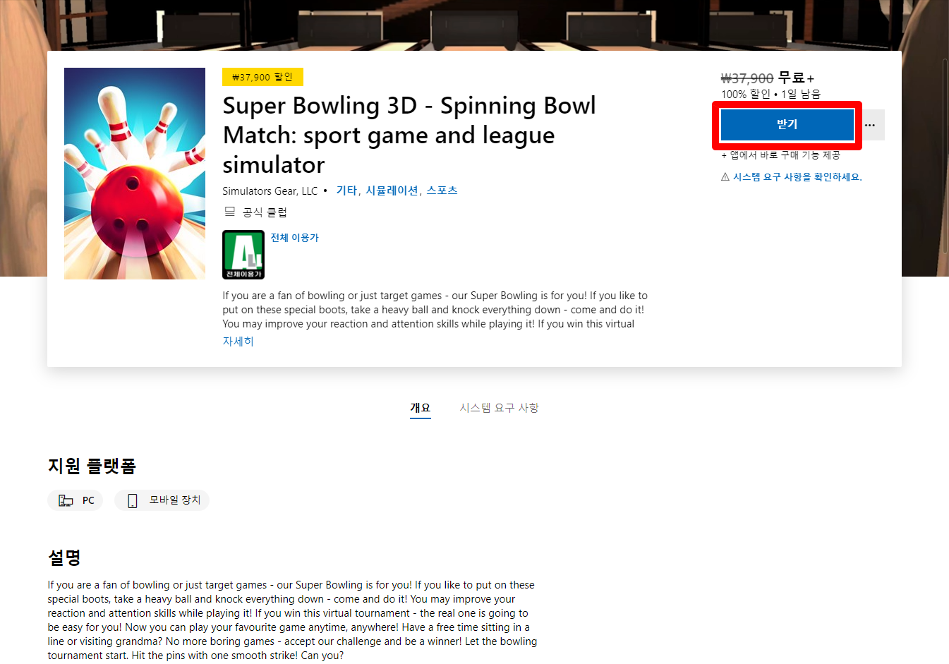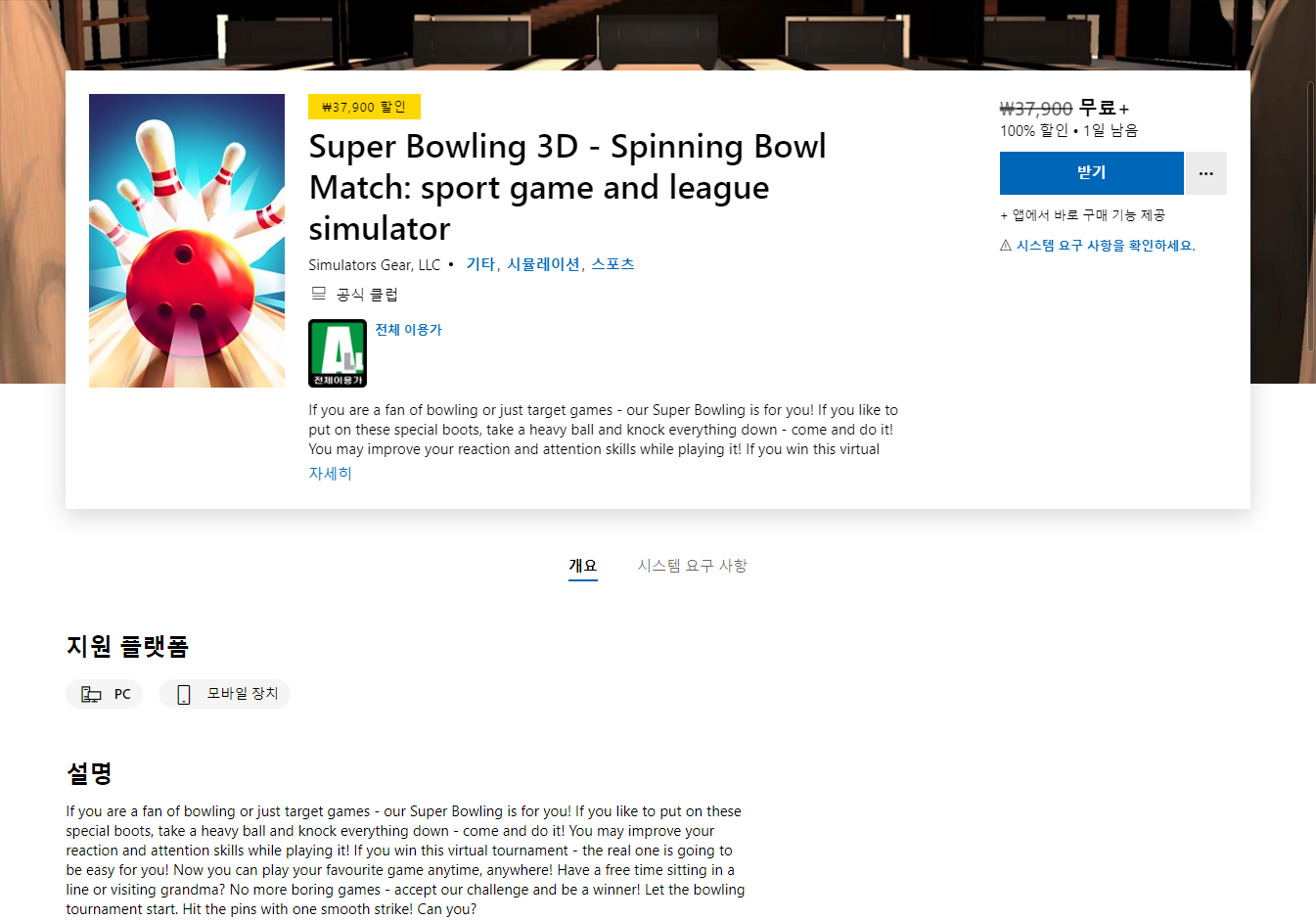 - "Super Bowling 3D" 무료 제공 페이지