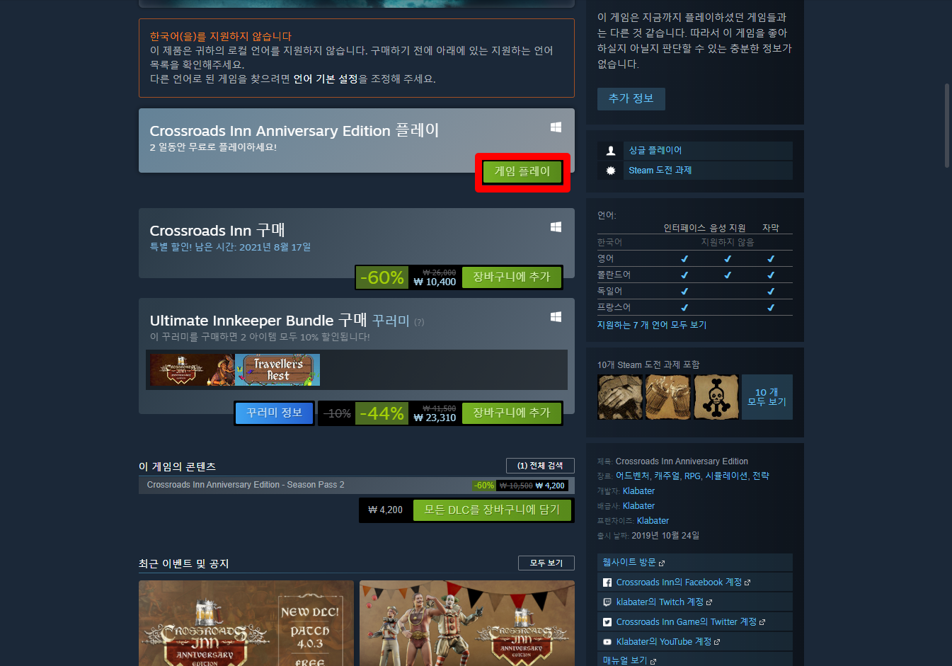 Crossroads Inn Anniversary Edition 크로스로드 인 애니버서리 애디션- Steam 스팀 금주 무료 플레이 Play for Free weekend on Steam 스팀