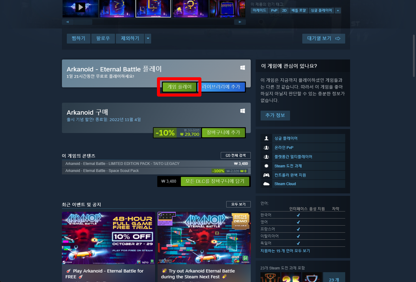 "Arkanoid - Eternal Battle" 게임페이지를 조금 내려서 [게임 플레이] 버튼을 클릭하면 됩니다.