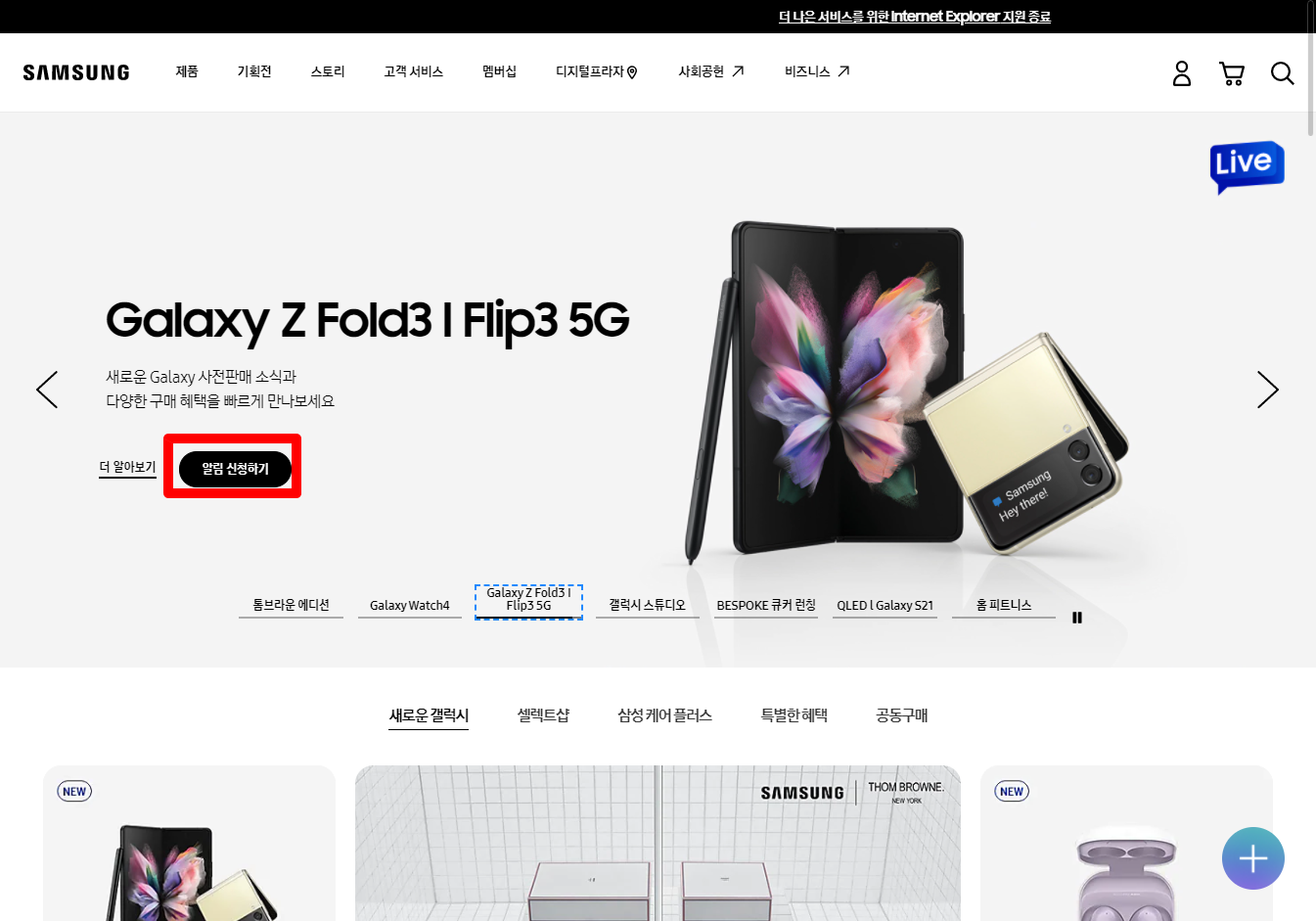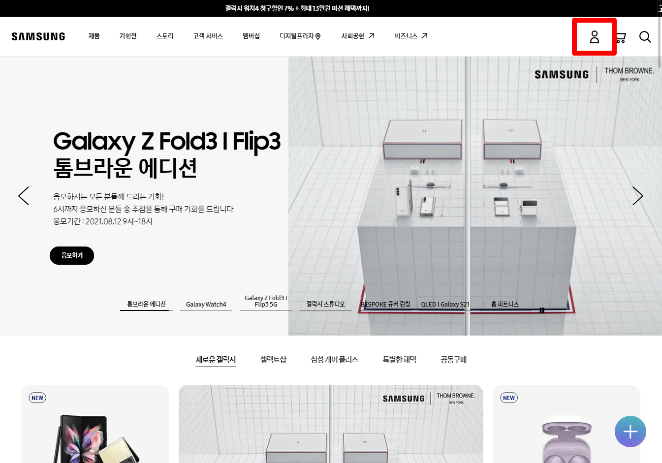 메인페이지 배너에서 [Galaxy Z Fold3 | Flip3 5G]를 클릭합니다.
