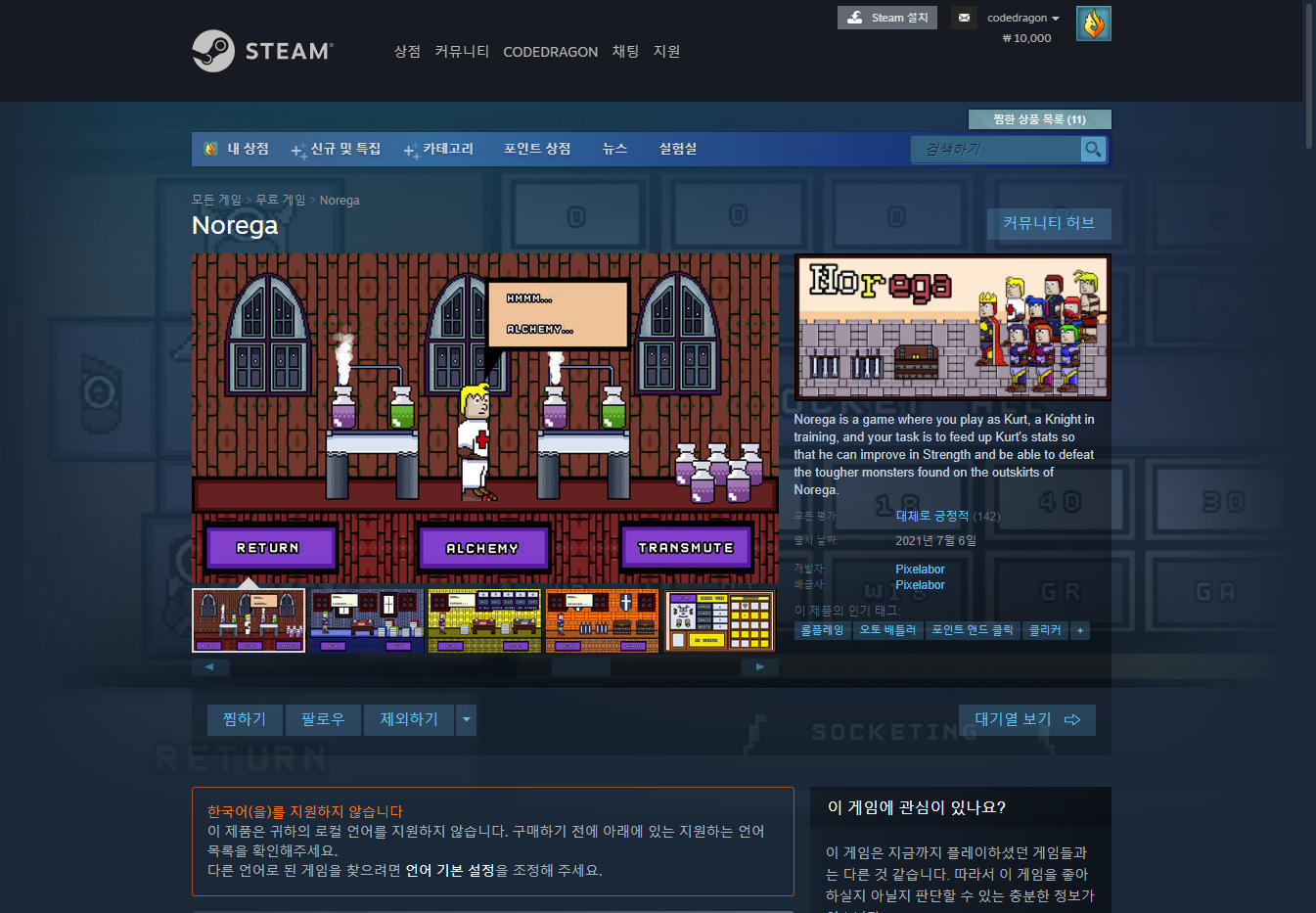 "Norega" 스팀 페이지 입니다.
