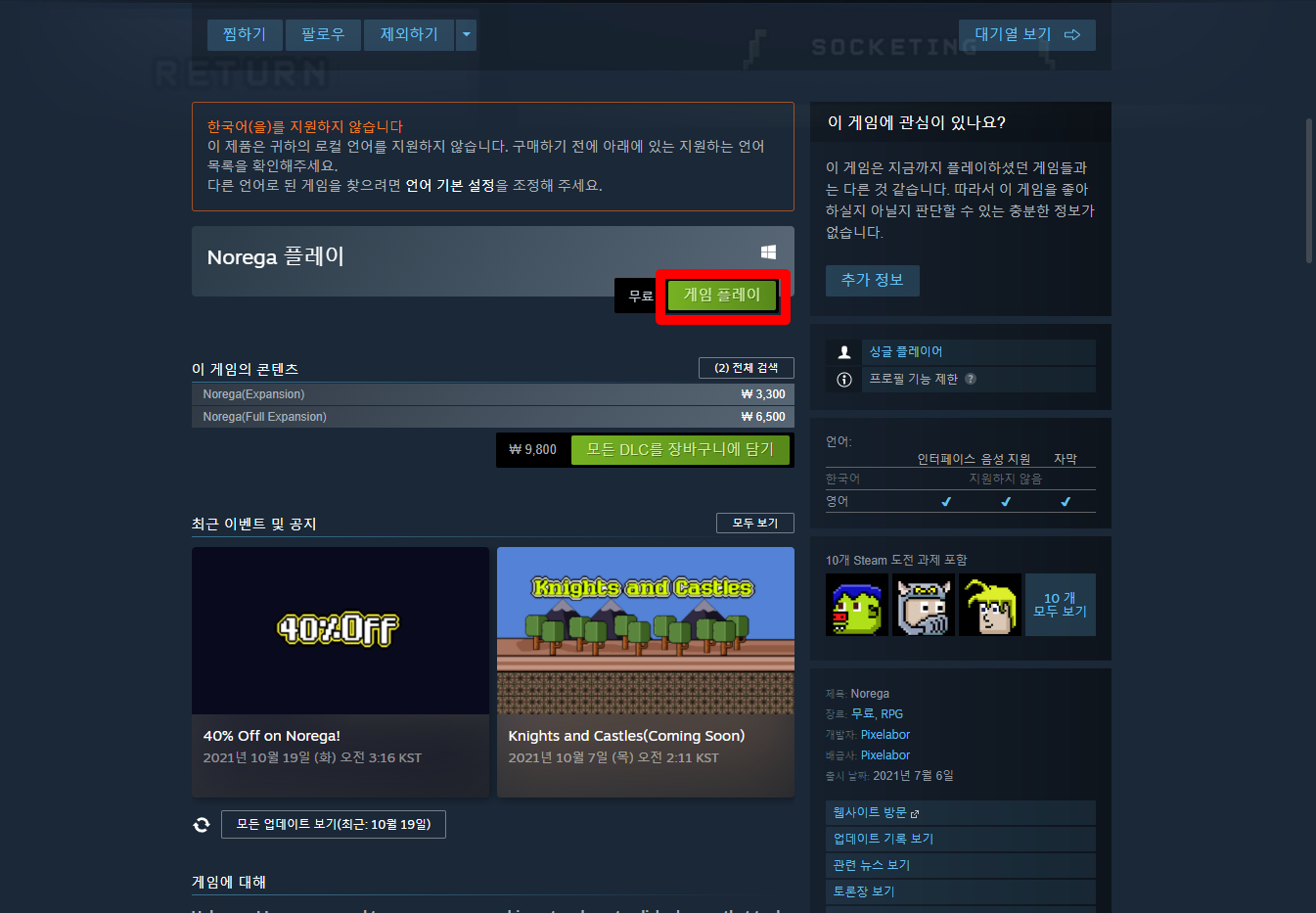 "Norega" 스팀 페이지 입니다.