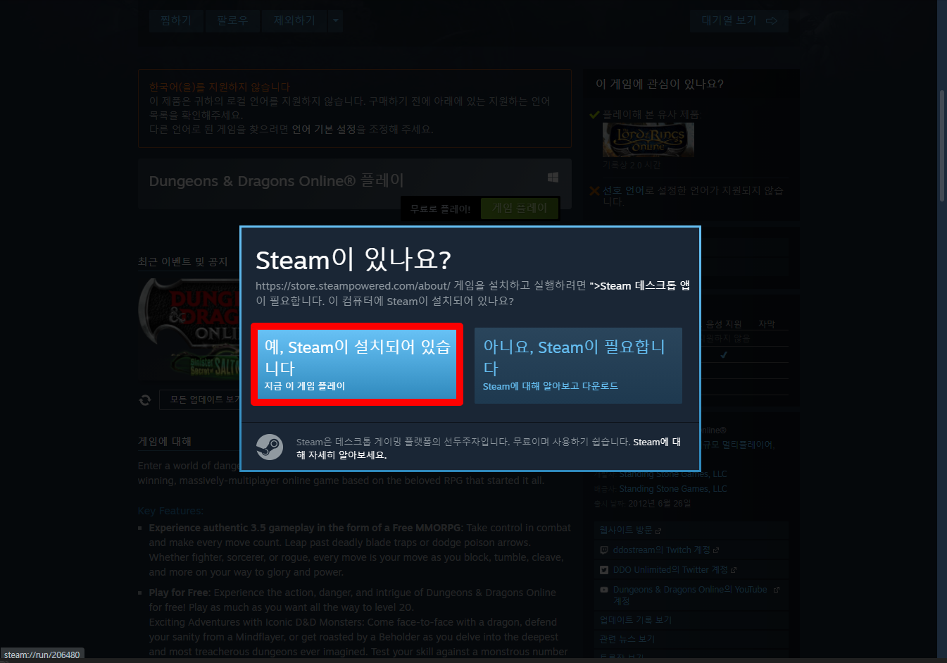저는 Steam 런처가 설치되어 있어 왼쪽 버튼을 클릭하겠습니다.