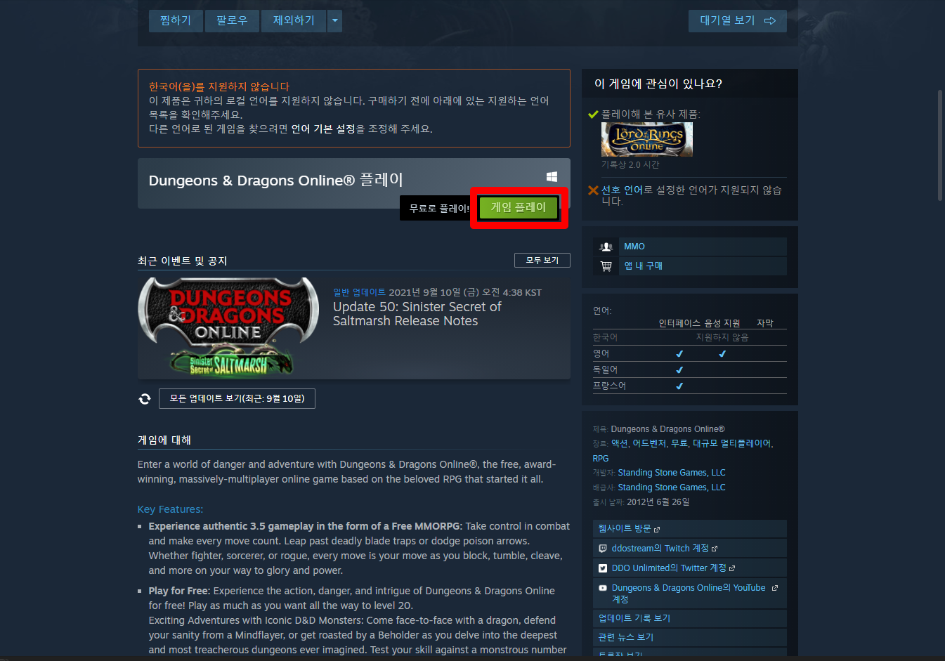 "Dungeons & Dragons Online" 게임 페이지에 접속합니다.