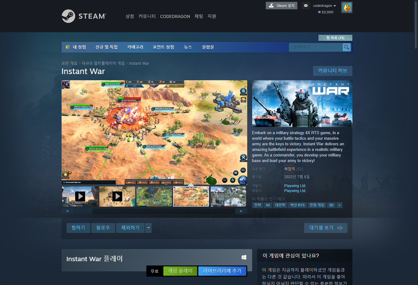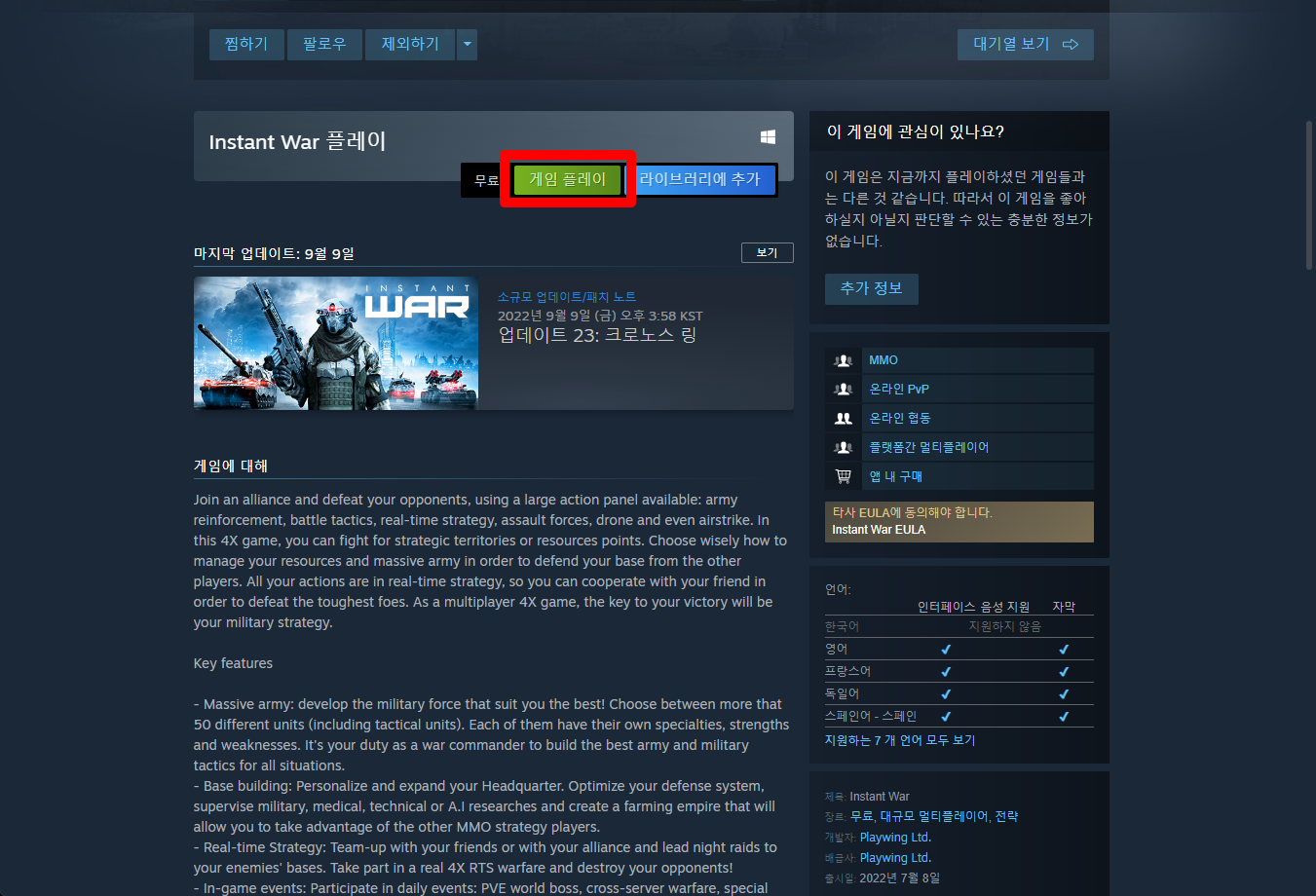 "Instant War" 페이지를 내려 [게임 플레이]를 클릭하면 됩니다.