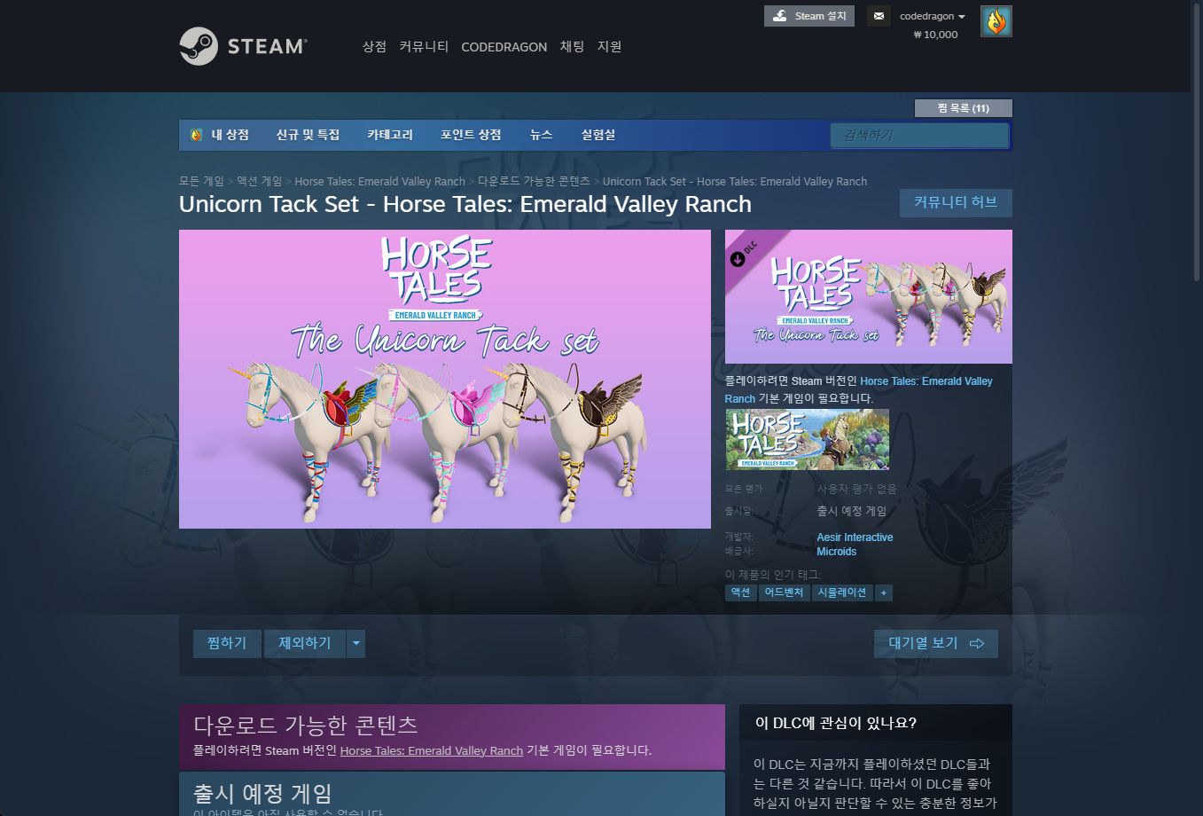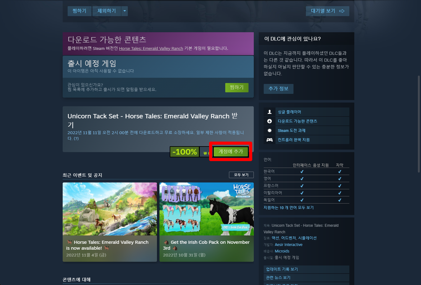 "Unicorn Tack Set - Horse Tales: Emerald Valley Ranch" 게임페이지를 조금 내려준 후 [계정에 추가] 버튼을 클릭하면 게임라이브러리에 추가됩니다.