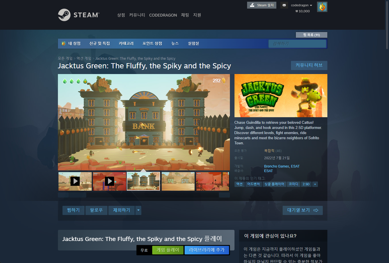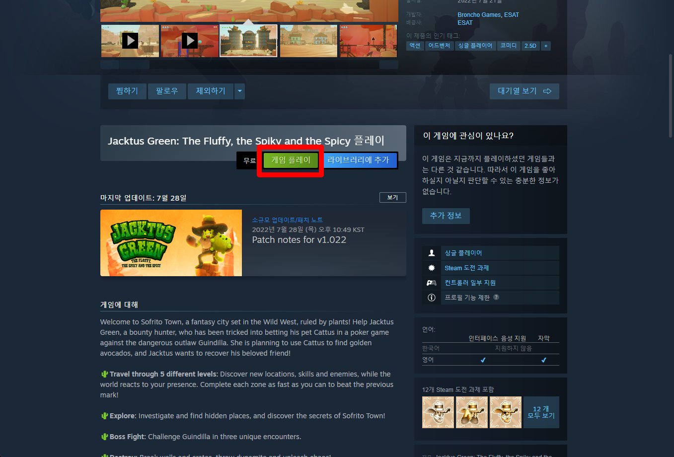 "Jacktus Green: The Fluffy, the Spiky and the Spicy" 페이지를 내려 [게임 플레이]를 클릭하면 됩니다.