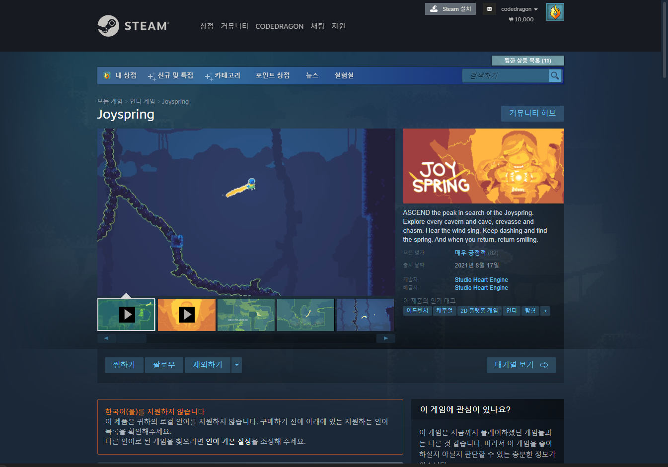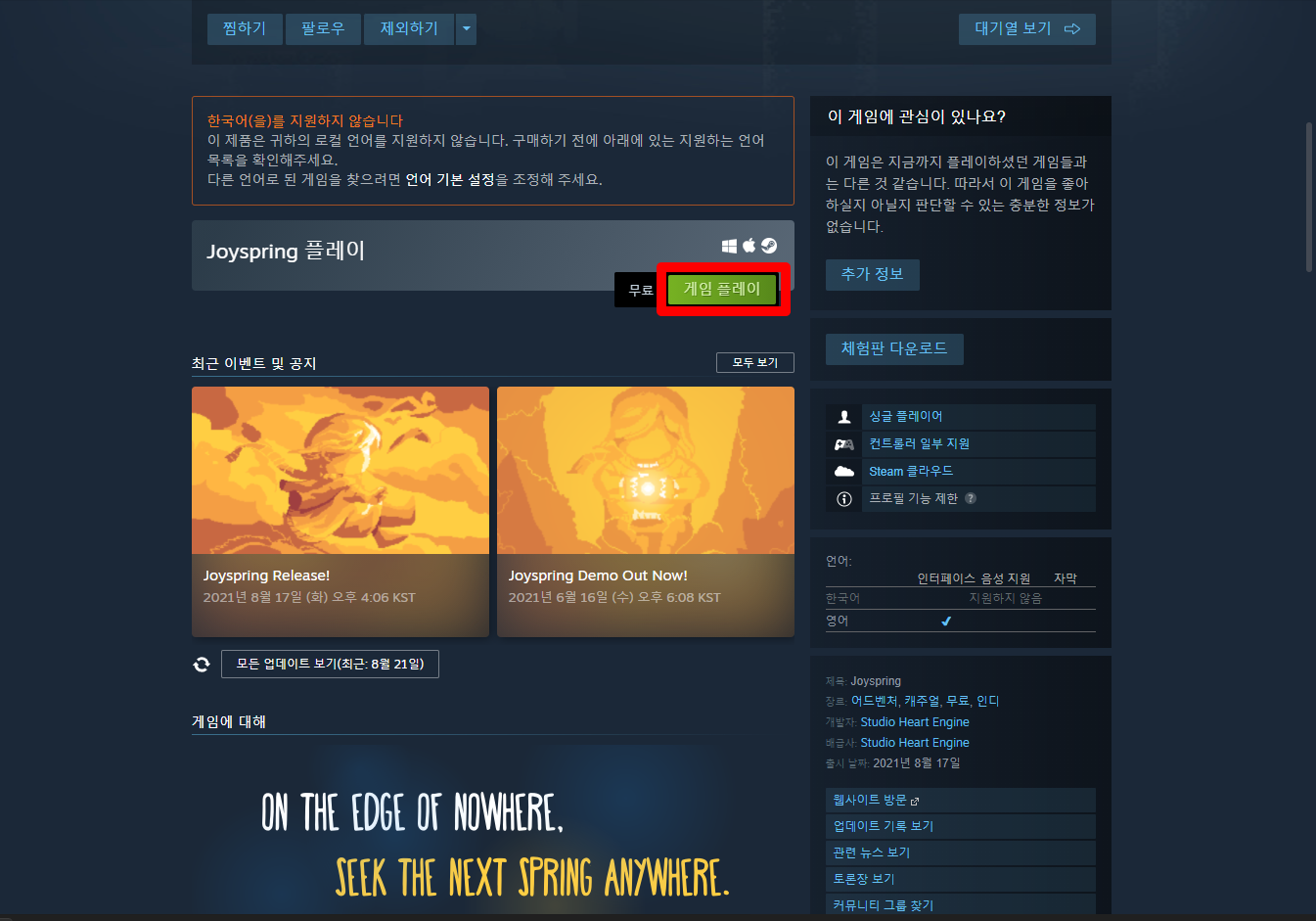"Joyspring" 스팀 페이지 입니다.