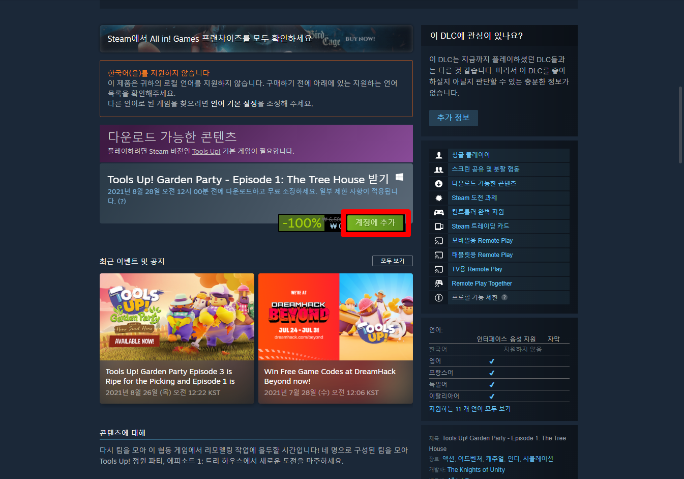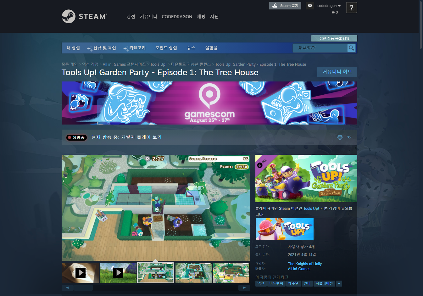 - "Tools Up! Garden Party - Episode 1: The Tree House" DLC 게임 페이지 (DLC)
