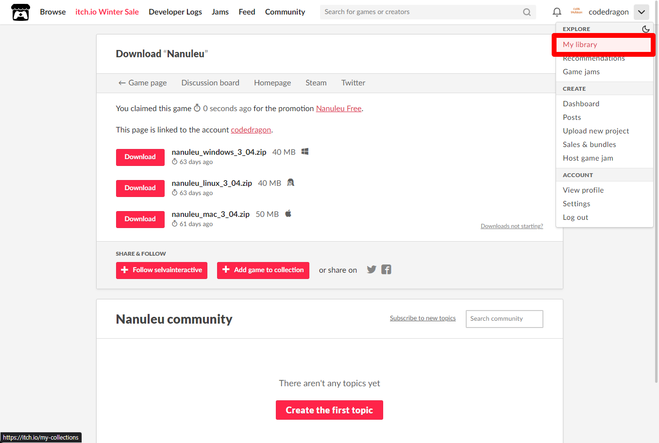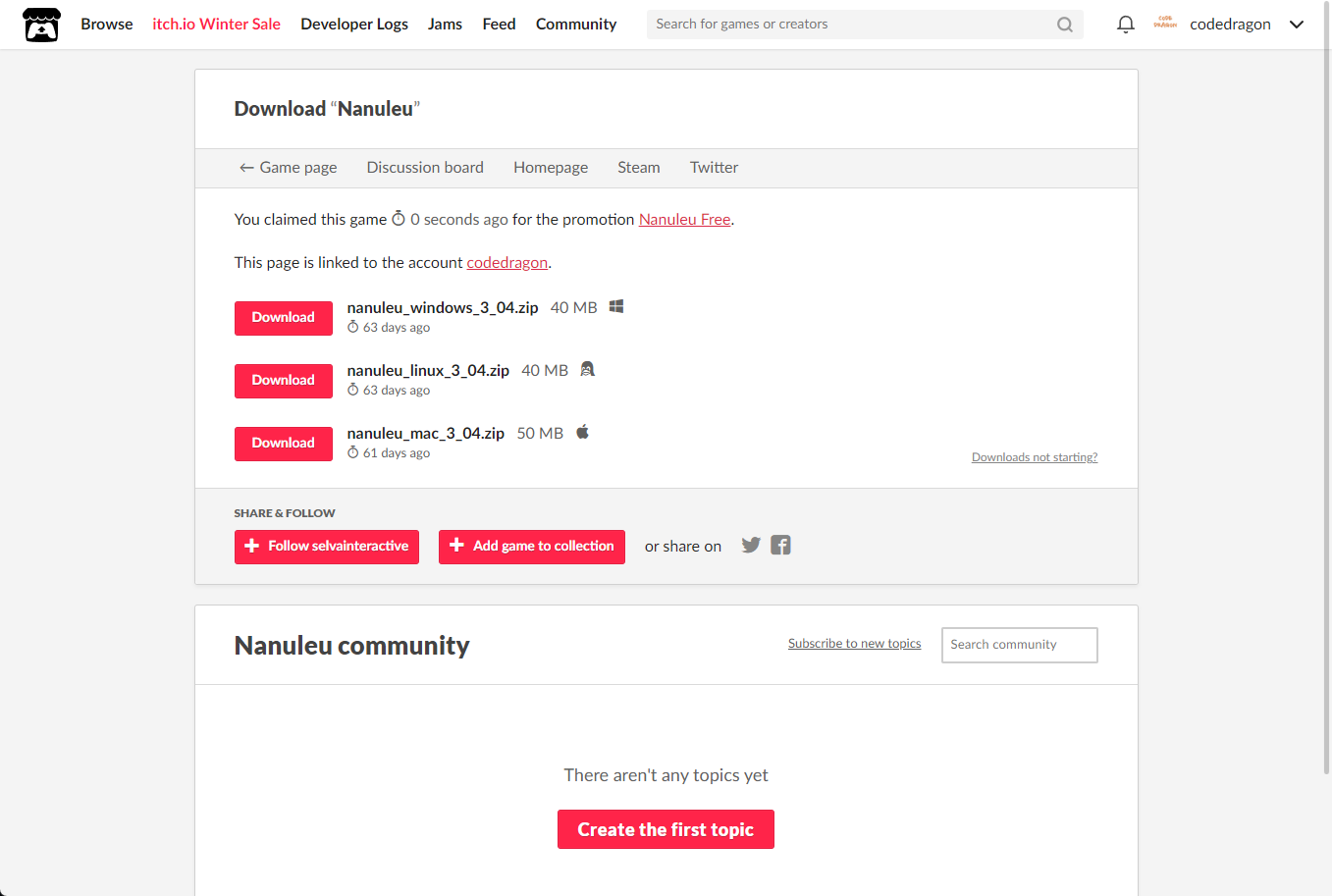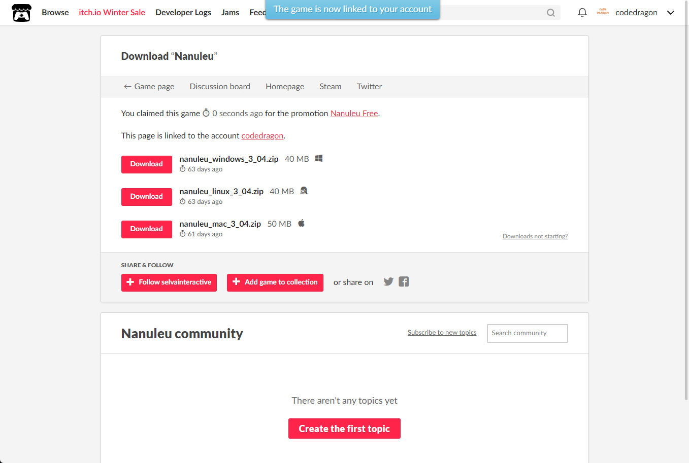 [Claim game]을 클릭하면 "Nanuleu" 게임이 나의 게임 라이브러리에 추가되고 설치파일을 다운받을 수 있는 페이지로 이동됩니다.