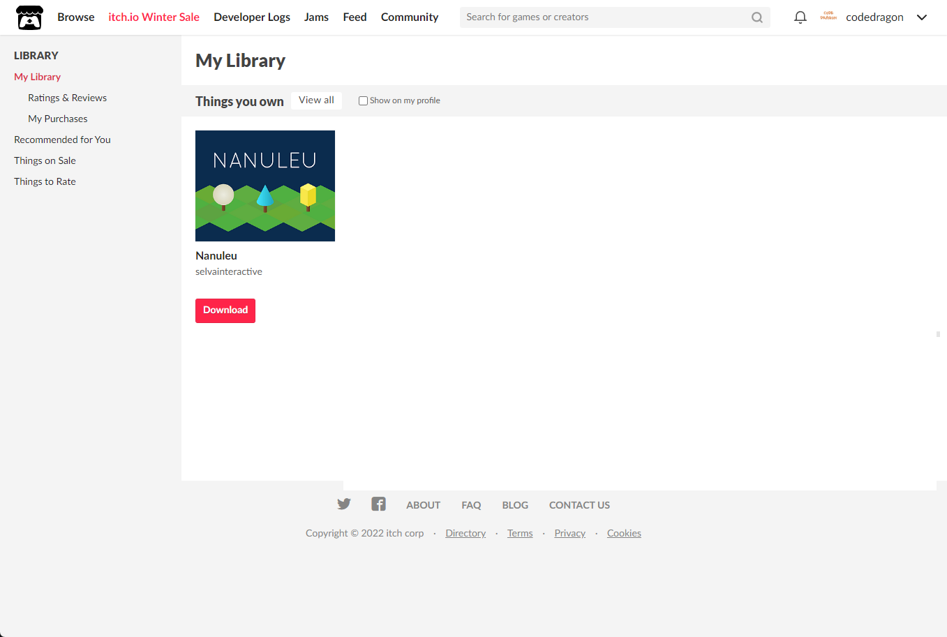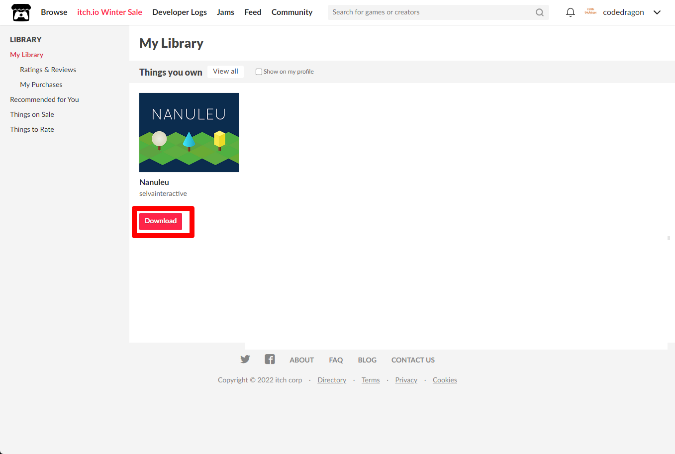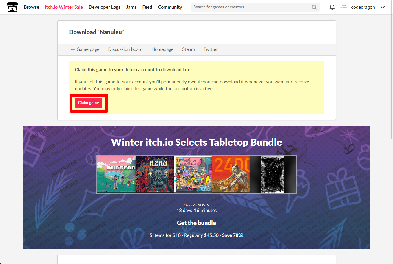 [Claim game]을 클릭하면 "Nanuleu" 게임이 나의 게임 라이브러리에 추가되고 설치파일을 다운받을 수 있는 페이지로 이동됩니다.