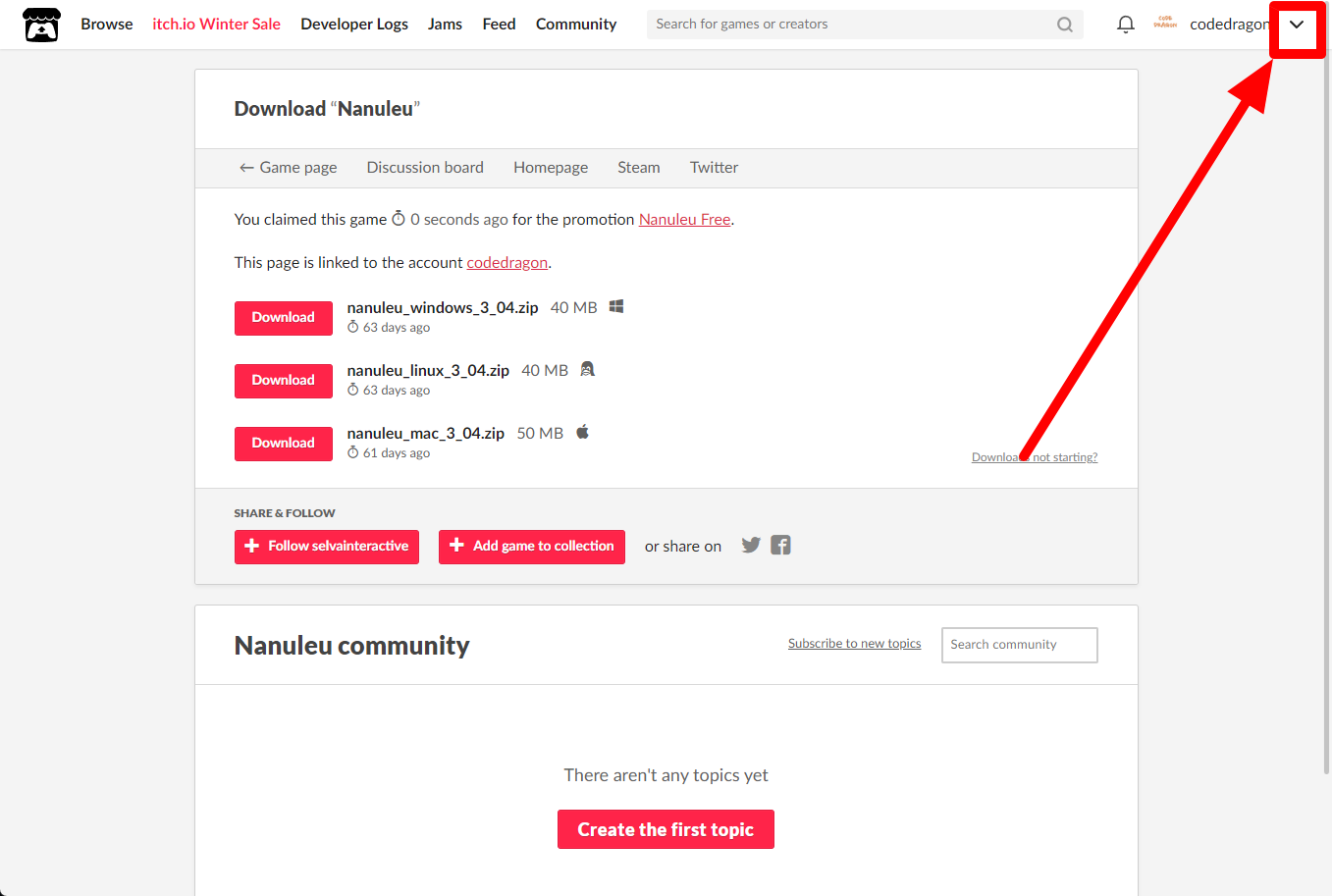 itch.io에서 받은 "Nanuleu" 게임 확인하고 설치파일 다운받아 보겠습니다. 우측 상단의 나의 사용자명 오른쪽의 화살표 아이콘을 클릭합니다.