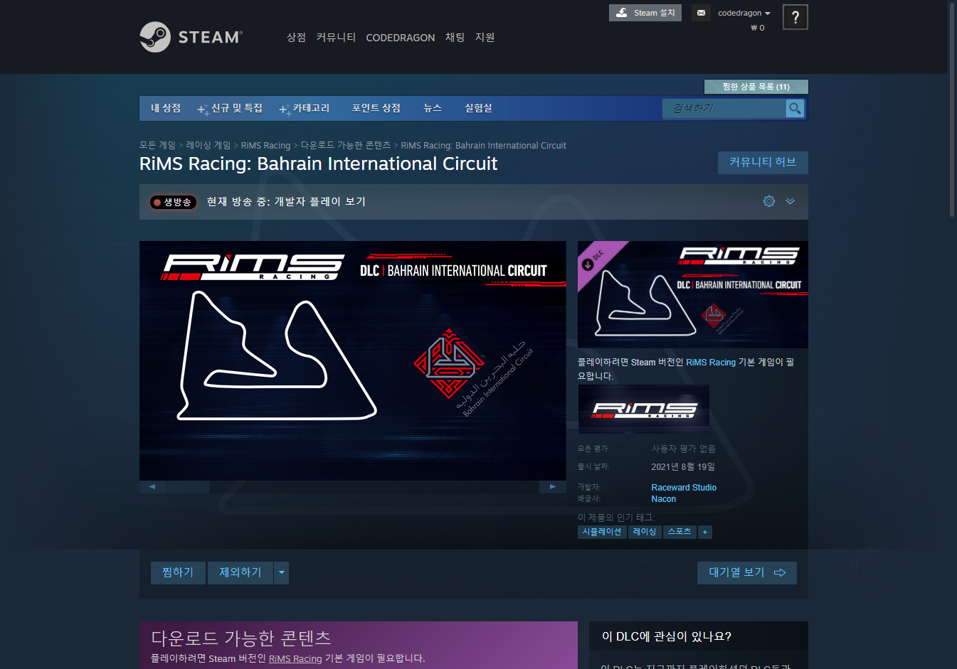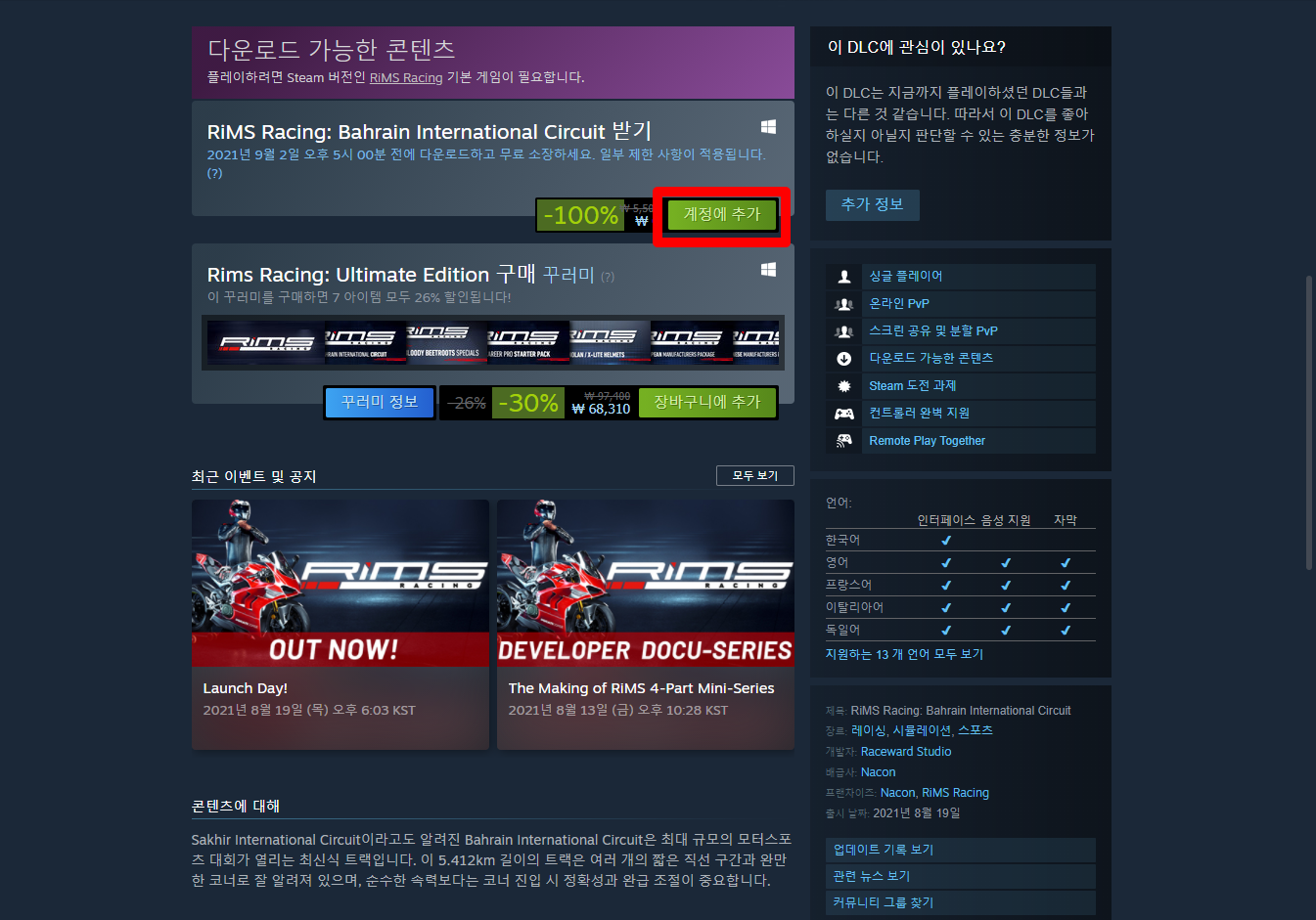 "RiMS Racing: Bahrain International Circuit" 게임 페이지 (DLC)