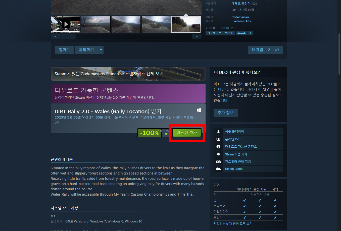 "DiRT Rally 2.0 - Wales (Rally Location)" 게임페이지를 조금 내려준 후 [계정에 추가] 버튼을 클릭하면 게임라이브러리에 추가됩니다.