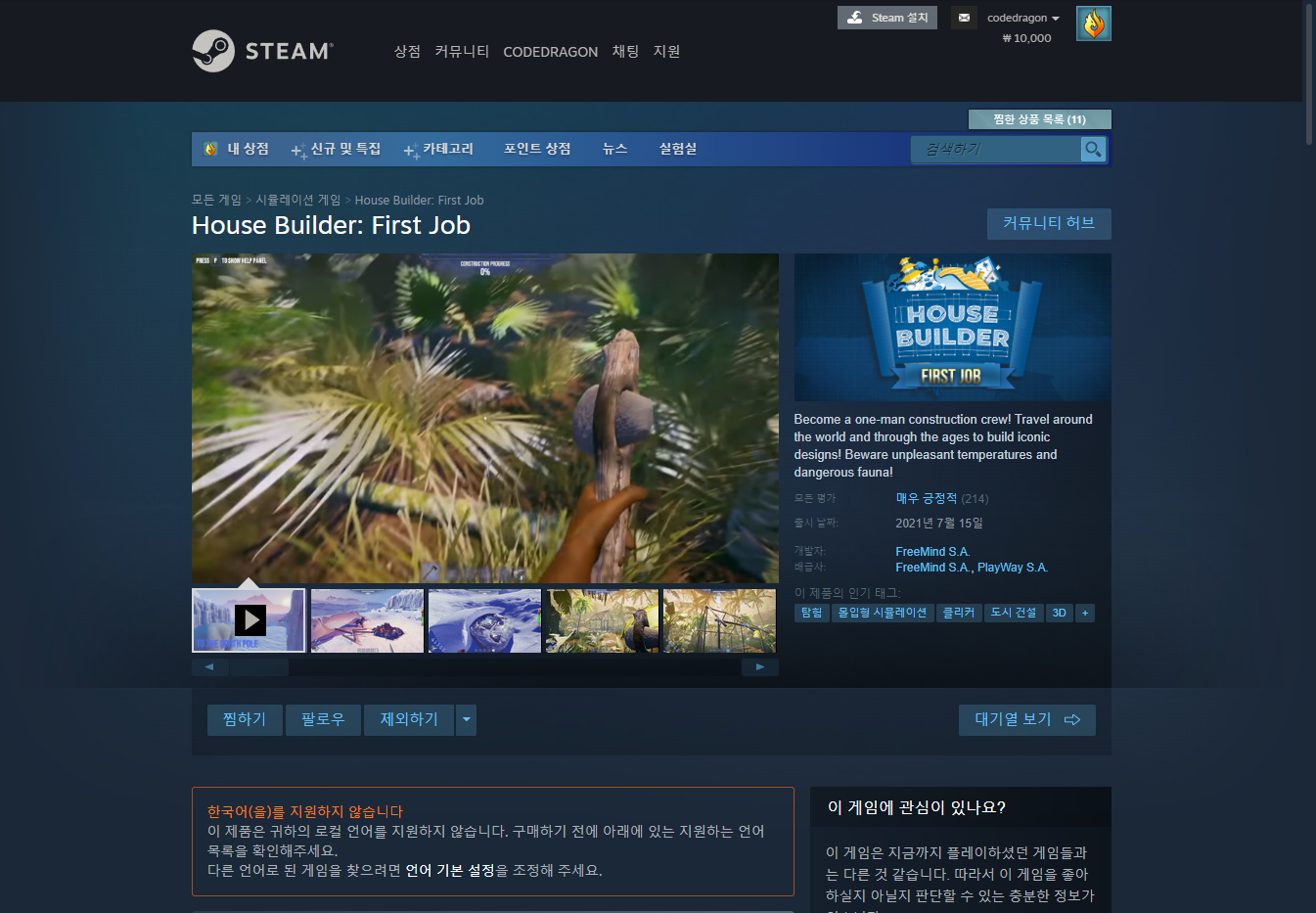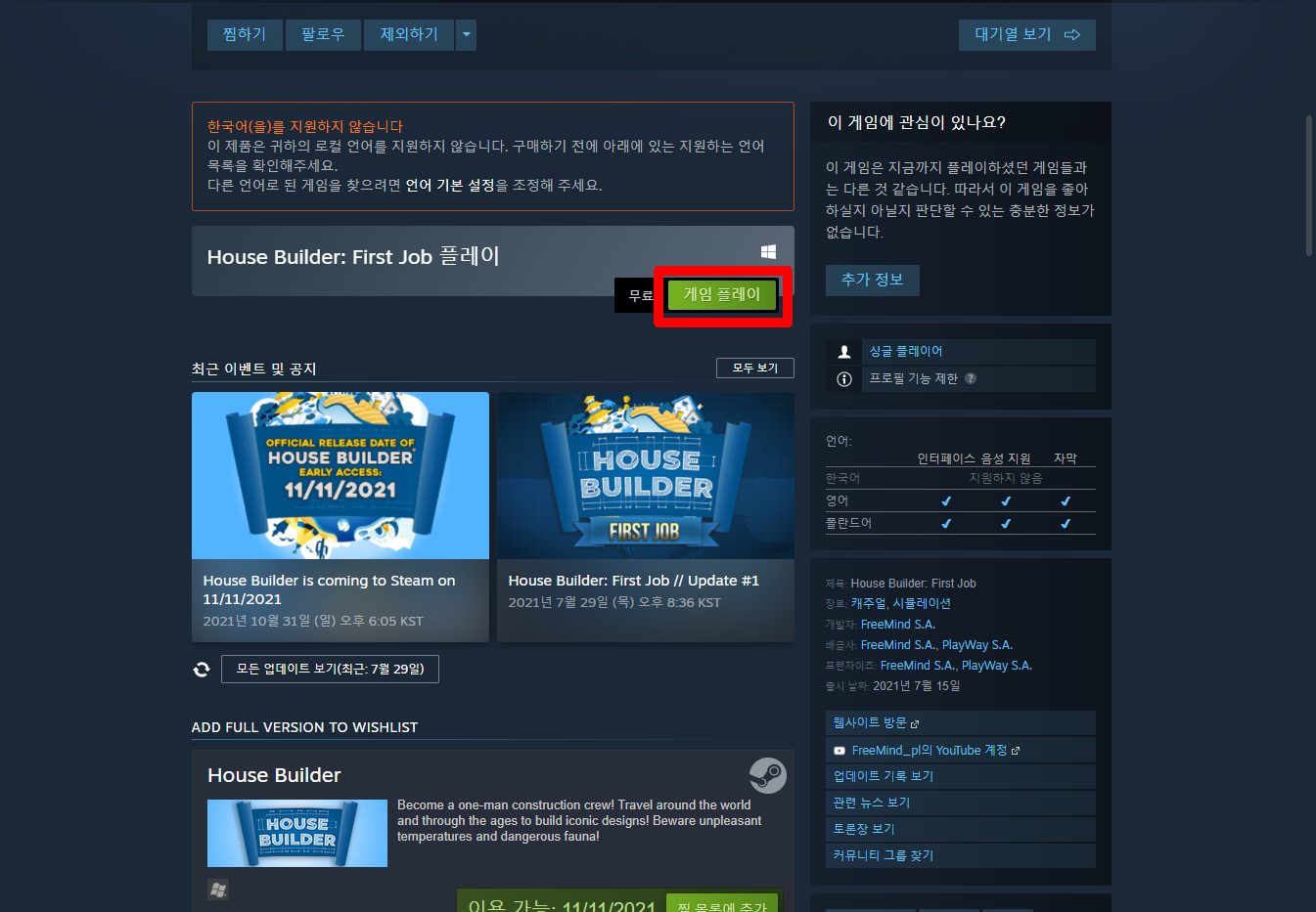 "House Builder First Job" 스팀 페이지 입니다.