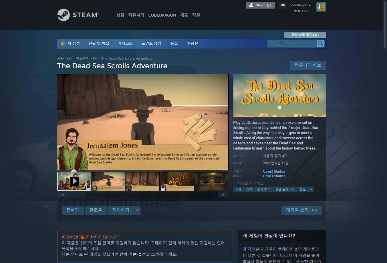 "The Dead Sea Scrolls Adventure" 스팀 페이지 입니다.