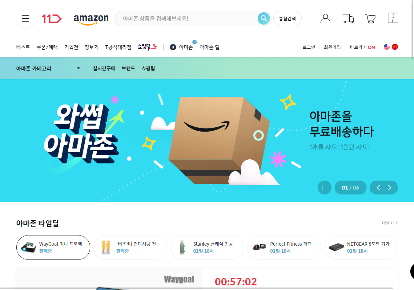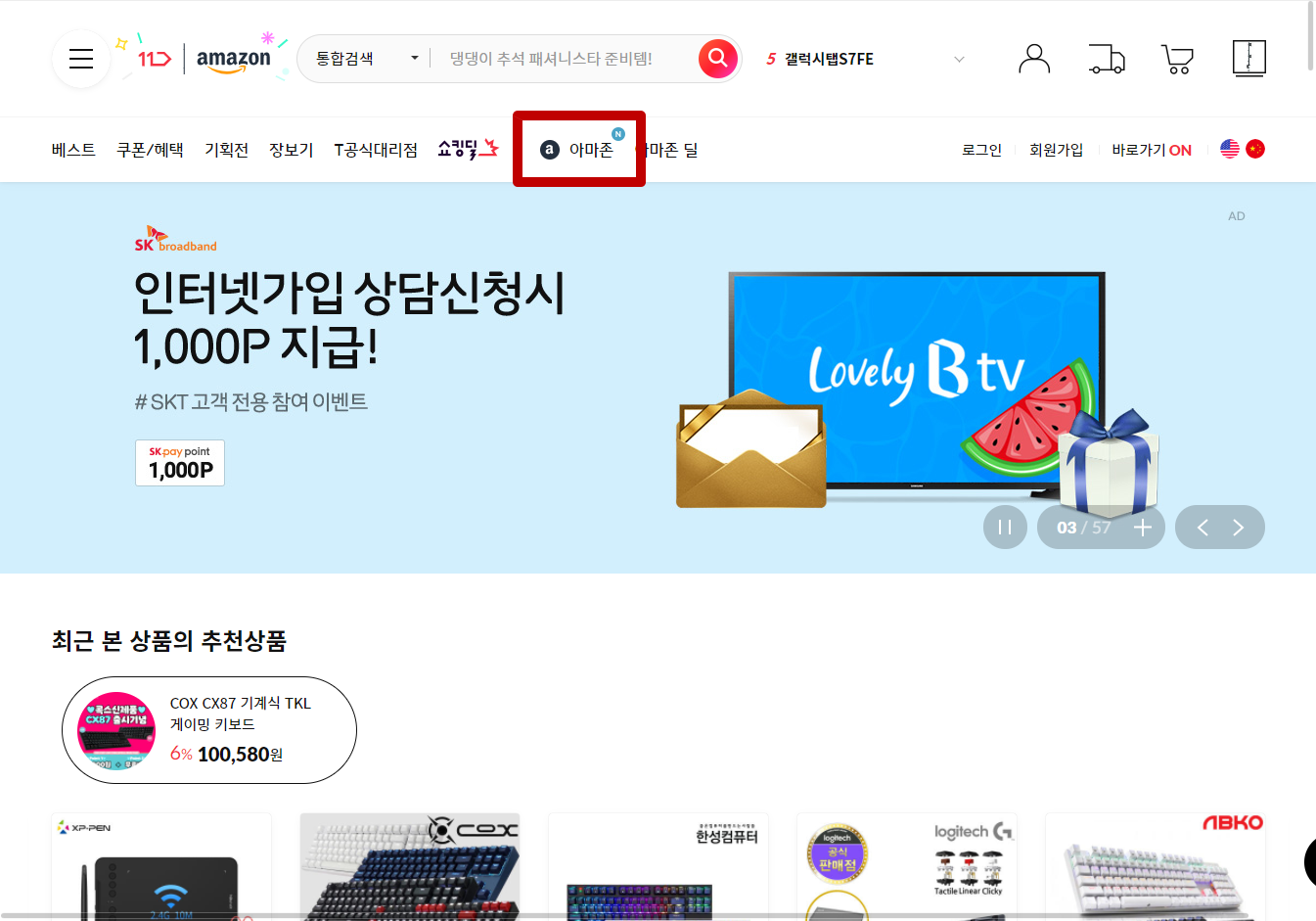 상단 메뉴에서 [아마존]을 클릭하면 아마존 상품 페이지로 이동됩니다.