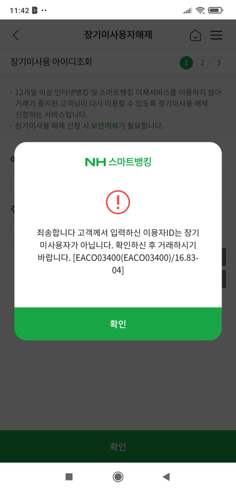 - 죄송합니다 고객께서 입력하신 이용자ID는 장기 미상요자가 아닙니다. 확인하신 후 거래하시기 바랍니다. [EACO03400(EACO03400)/16.83-04]