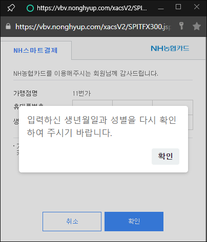 등록한 농협카드와 휴대폰 명의자가 동일하지 않을 경우에 발생합니다.