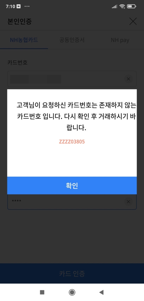 - ZZZZ03805 고객님이 요청하신 카드번호는 존재하지 않는 카드번호입니다. 다시 확인 후 거래하시기 바랍니다.