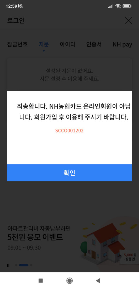 농협카드에 회원가입되어 있지 않으면 발생합니다. 서비스를 이용하기 위해서는 먼저 회원가입한 후 다시 시도해야 합니다.