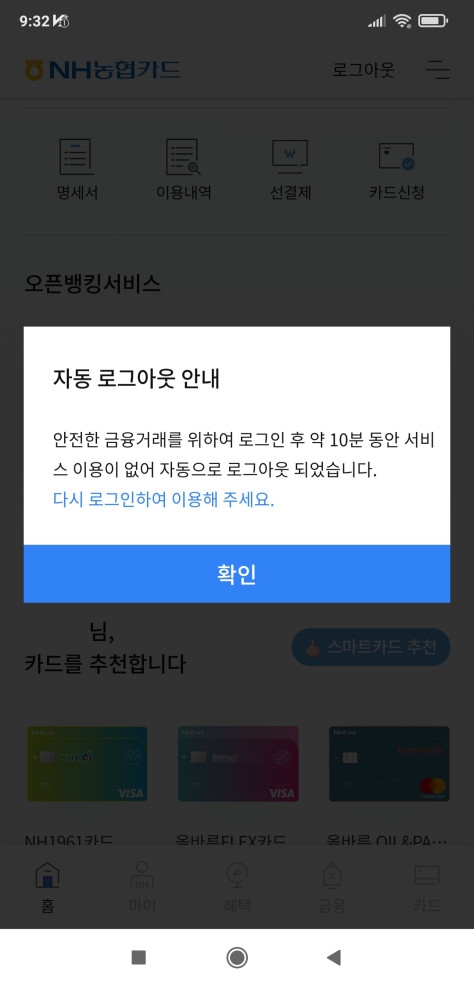 10분동안 앱을 활성화하지 않은 경우 자동로아웃되고 사용하기 위해서는 다시 로그인해야 합니다.