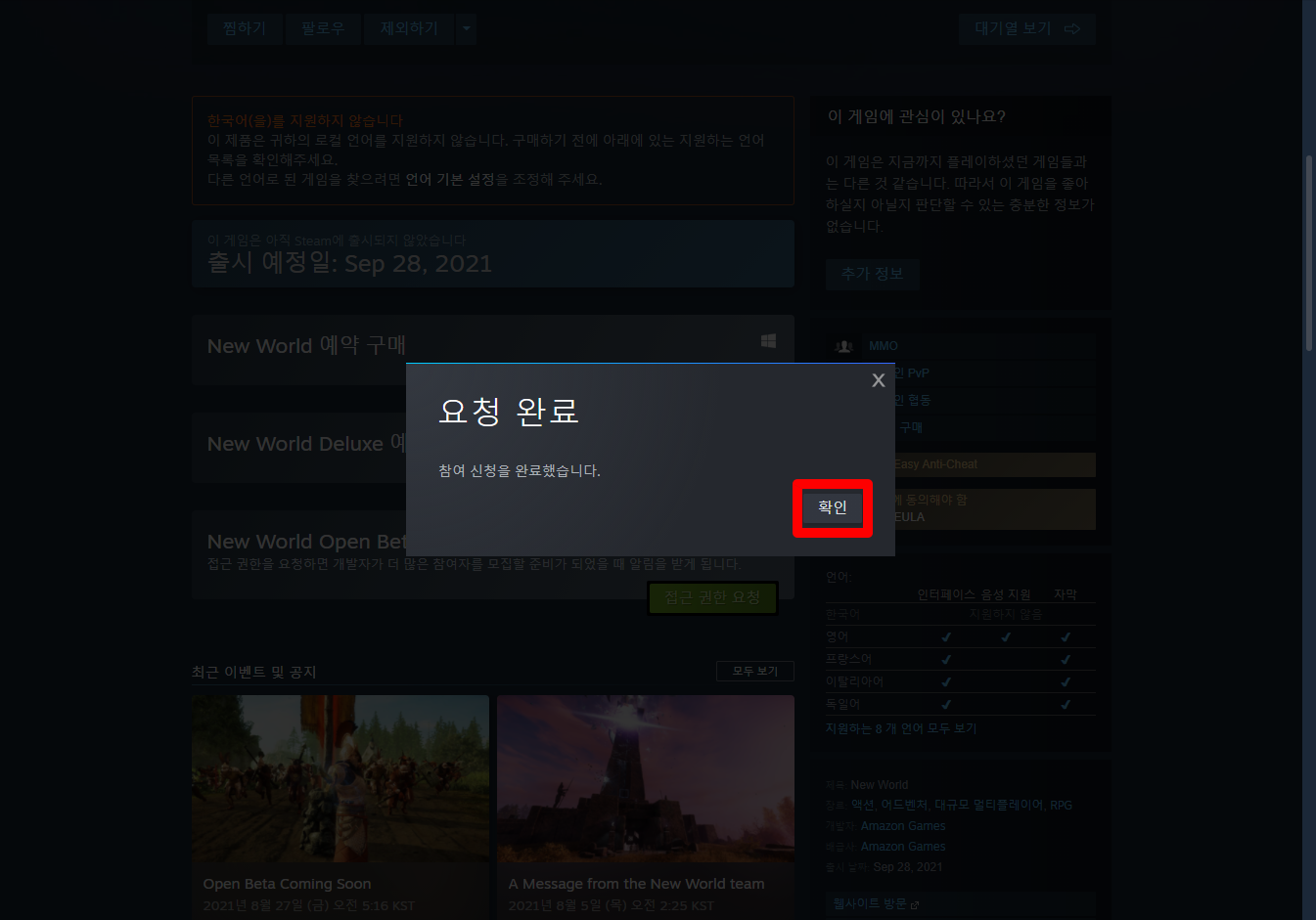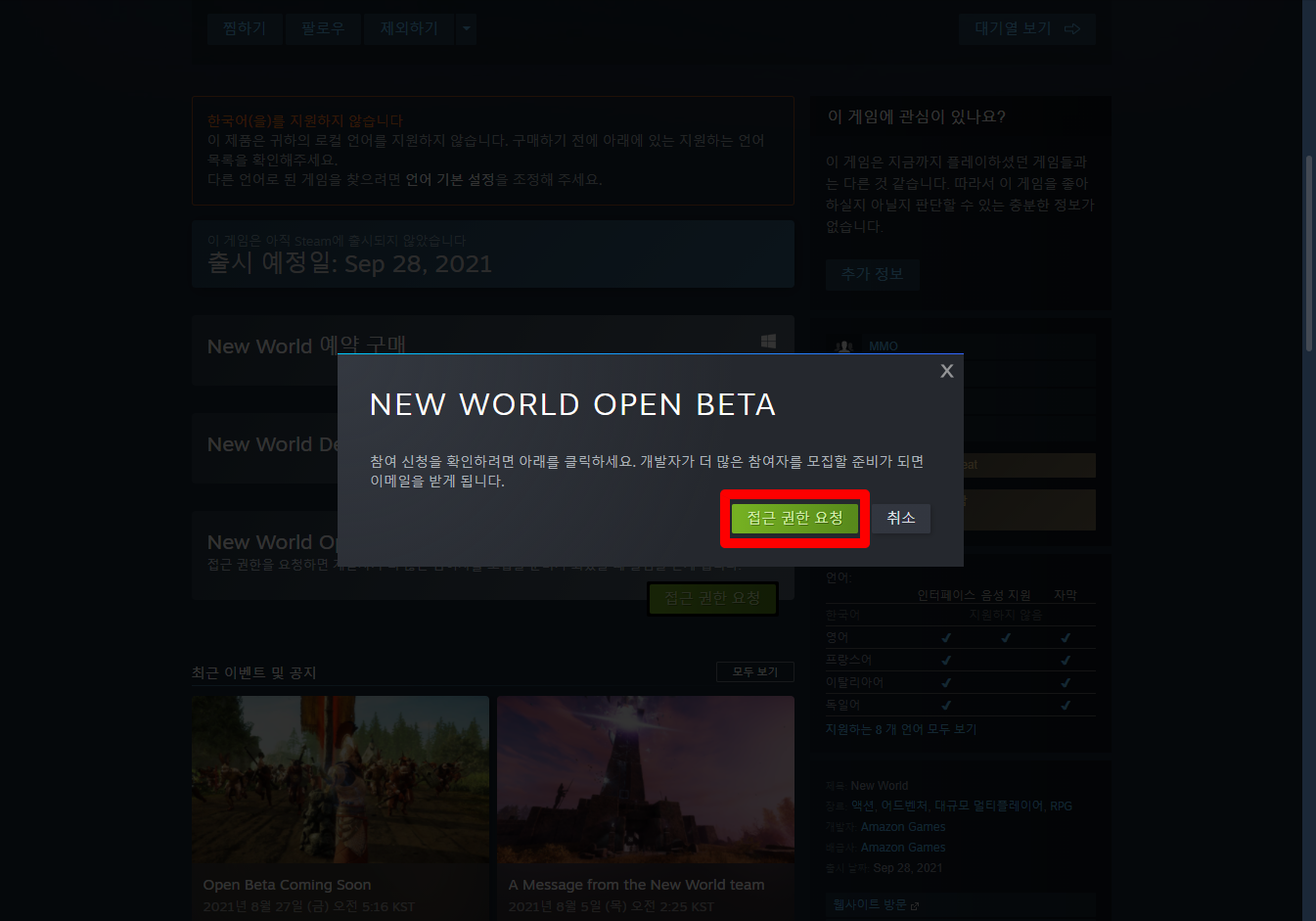 게임페이지를 조금 내려서 [접근 권한 요청] 버튼을 클릭하면 됩니다.