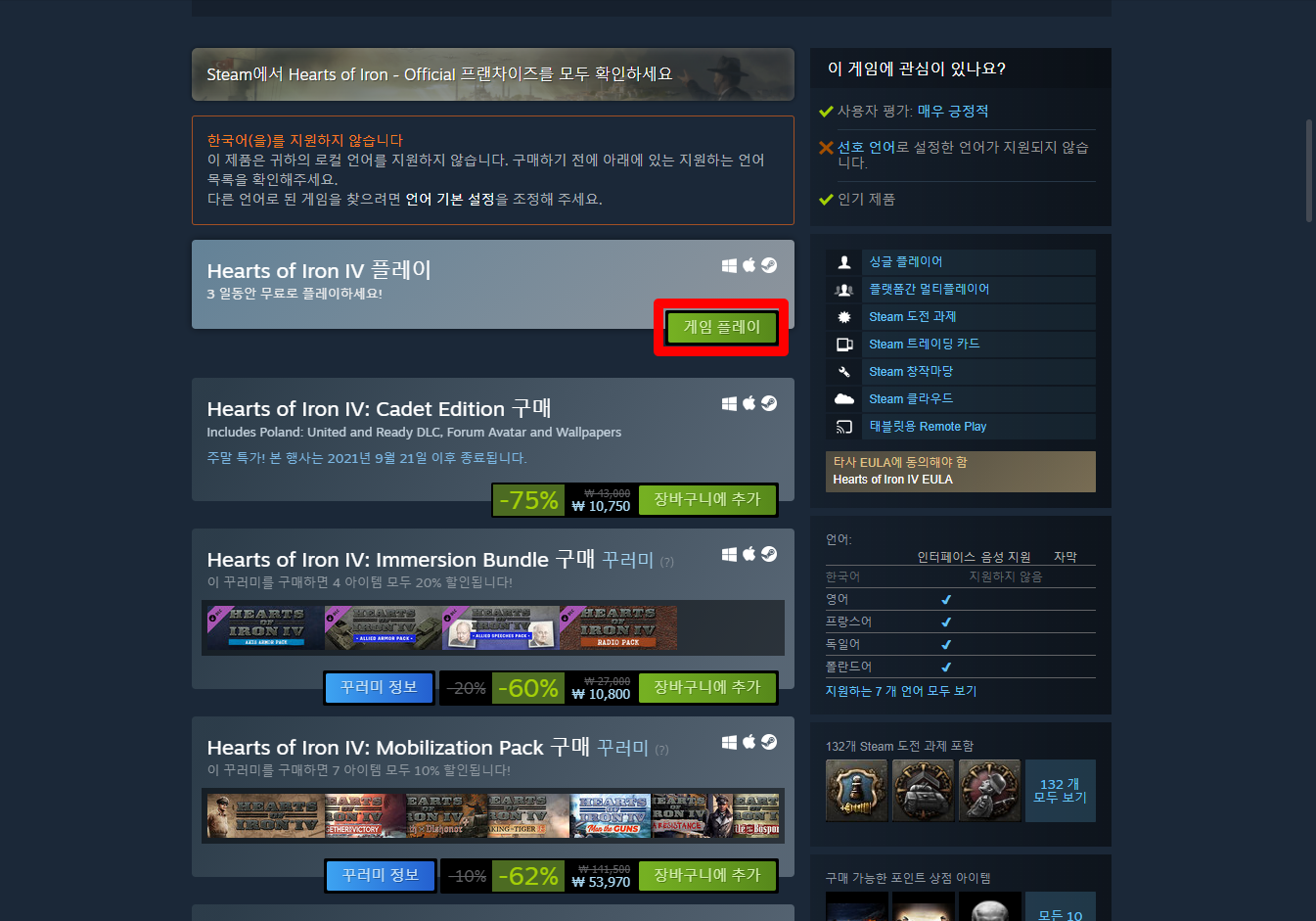 "Hearts of Iron IV 하츠 오브 아이언 4" 게임페이지를 조금 내려서 [게임 플레이] 버튼을 클릭하면 됩니다.