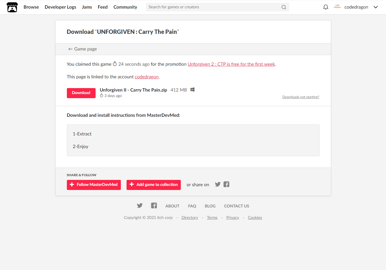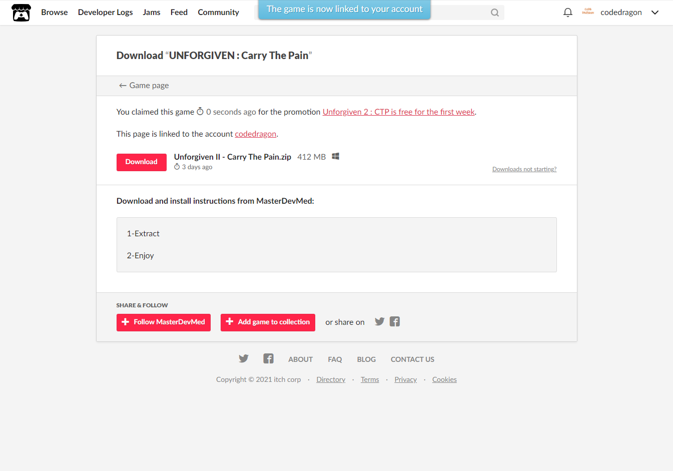 [Claim game]을 클릭하면 나의 게임 라이브러리에 추가되고 설치파일을 다운받을 수 있는 페이지로 이동됩니다.