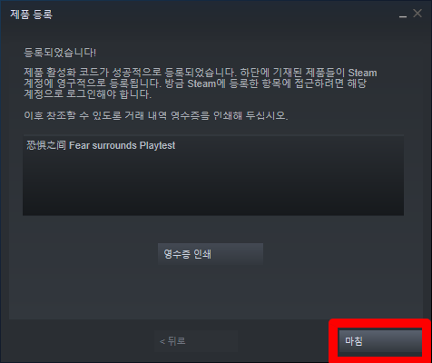 게임명이 표시되고 등록이 완료됩니다. [마침] 클릭합니다.