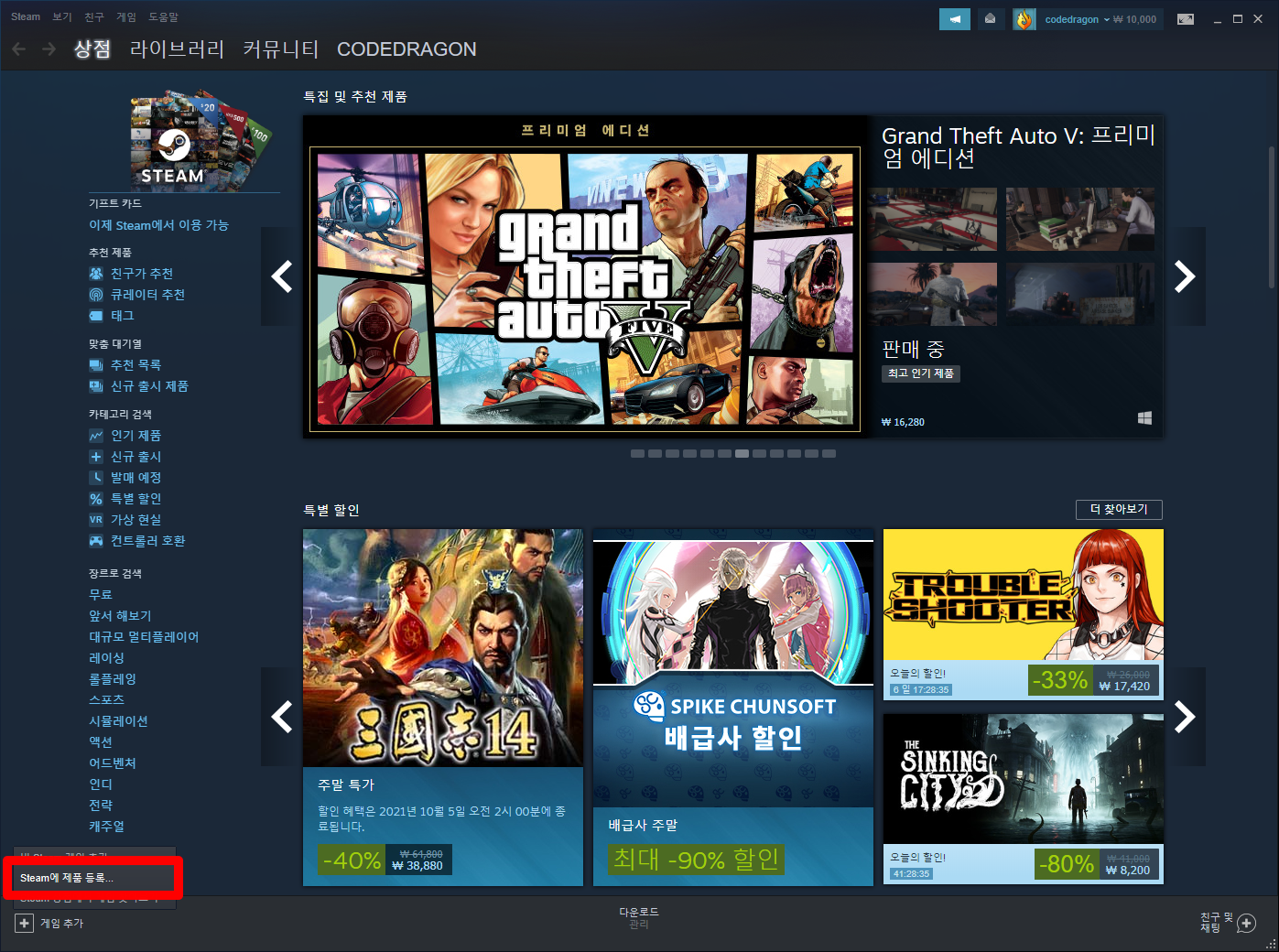 나오는 메뉴에서 [Steam에 제품 등록]을 클릭합니다.
