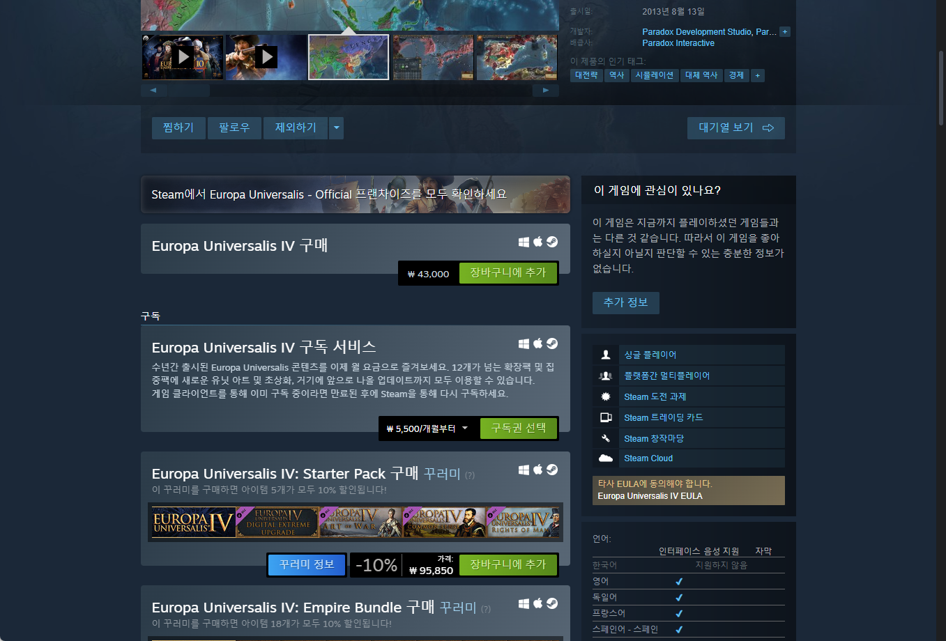 ₩43,000 -> ₩0 Europa Universalis IV 유로파 유니버설리스 4 무료로 받기 영구소장; 에픽 게임즈 epic games 한시적 무료 Get free copy