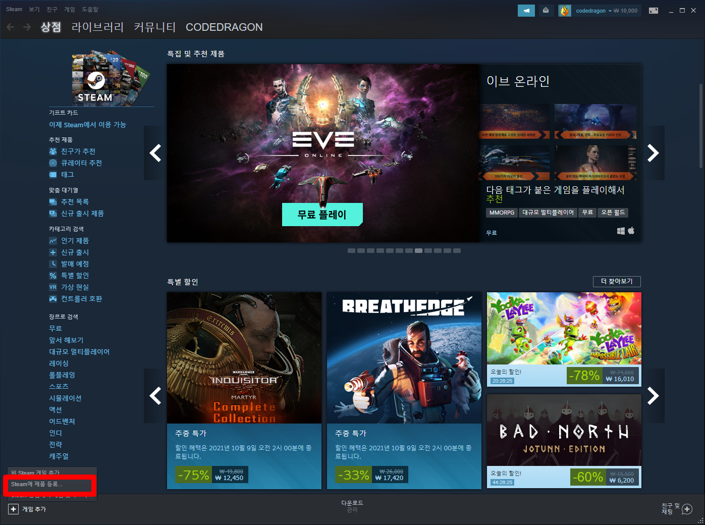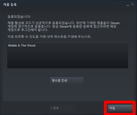나오는 메뉴에서 [Steam에 제품 등록]을 클릭합니다.
